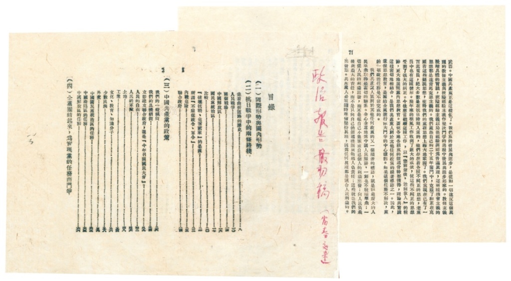 1945年4月,毛泽东在中国共产党第七次全国代表大会上作的政治报告。这是报告的过程稿