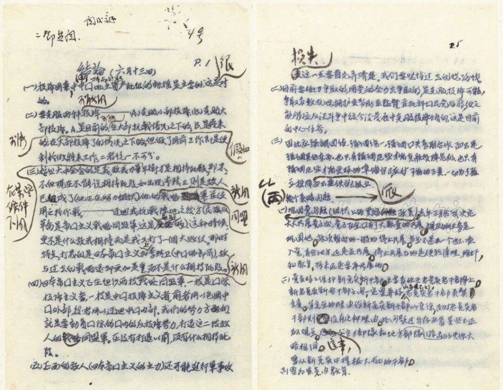 1939年6月13日,毛泽东在延安高级干部会议上关于反投降问题的结论提纲。