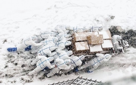 2020年12月,为应对新冠肺炎疫情,大连海洋大学决定封闭校园,学生在宿舍隔离。该校17名平均年龄19岁的热血青年,选择加入志愿者队伍,与教职工志愿者一起负责公寓区域师生生活和防疫物资的统一配送。图为志愿者们推着满载的三轮车上坡,将物资送到学生宿舍。 新华社发 大连海洋大学供图
