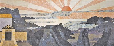 北京香山路上的石材镶嵌壁画《三山五园揽胜图》局部,描绘了香山革命旧址双清别墅,作者孙韬。 |