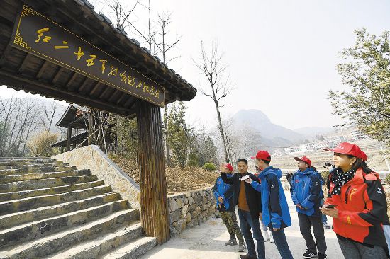 郧西县丁家坪村红二十五军223团政治部旧址。图为大学生在聆听红军转战当地的故事。 (湖北日报全媒记者 田悦 摄)