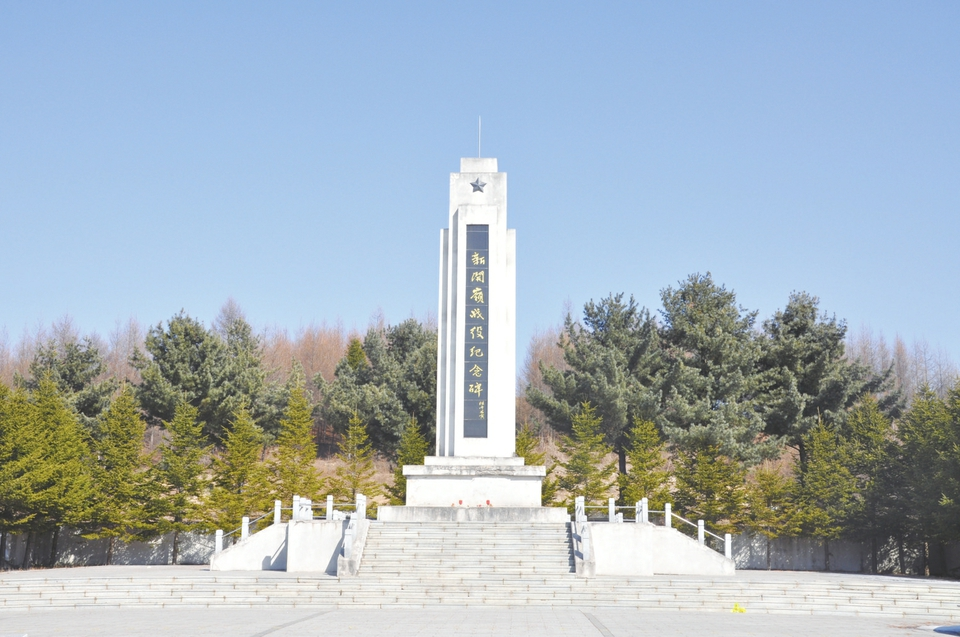 为纪念新开岭战役胜利40周年,缅怀牺牲的革命先烈,1986年10月,新开岭战役纪念碑在辽宁省凤城市爱阳镇建成。碑的正面由曾任东北局副书记兼南满分局书记的陈云题写“新开岭战役纪念碑”,侧面由曾任东北民主联军副总司令的萧劲光题写“新开岭战役四十周年”,背面书刻碑文,2006年重修纪念碑,碑文改刻在陵园的墙壁上,全文如下: