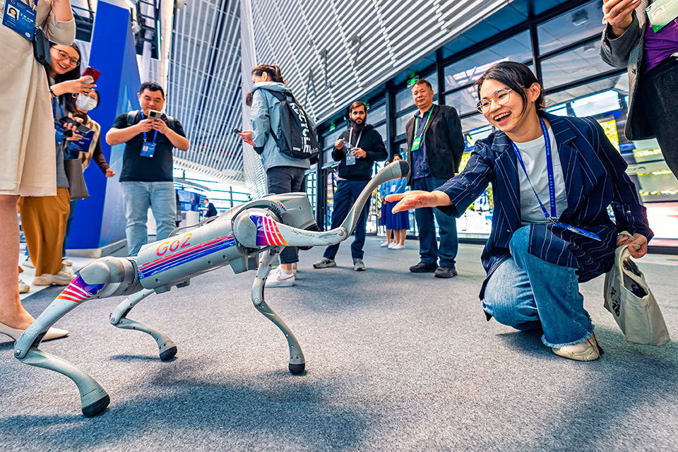 11月7日,2023年世界互联网大会“互联网之光”博览会在浙江省嘉兴市桐乡市乌镇启幕,图为观众在博览会上与仿生四足机器人互动。
