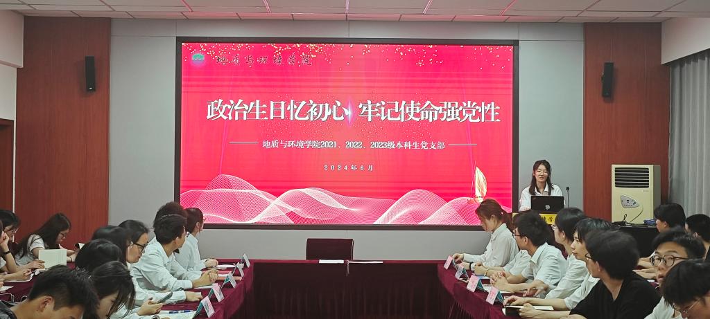 6月11日,地质与环境学院2021、2022、2023级本科生党支部开展“政治生日忆初心,牢记使命强党性”主题党日活动。会议由支部书记陈艳丽主持,全体党员参加。