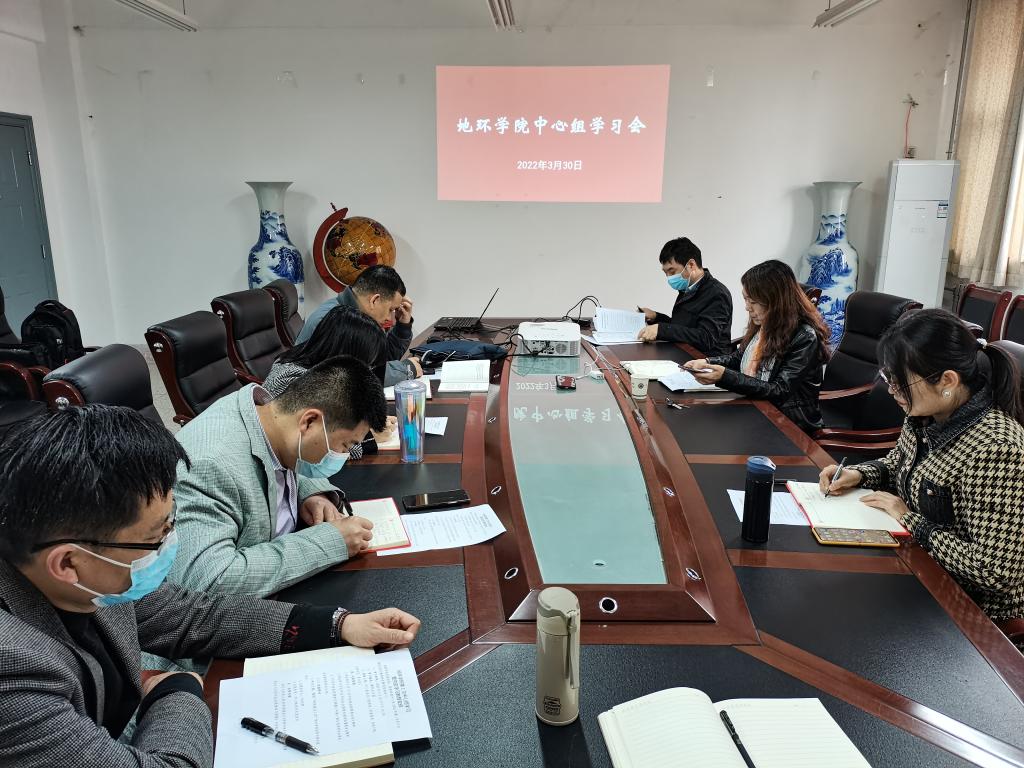 3月30日下午,地环学院在临潼校区骊山校园学院办公室召开中心组学习会议,传达学习有关会议文件精神。会议由地环学院党委书记赵雪萍主持,地环学院中心组成员参加了会议。