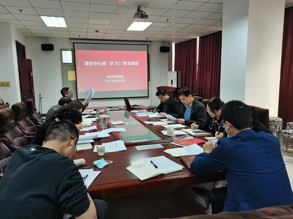 3月24日下午,地环学院在雁塔校区学院会议室召开2021年第一次党委理论学习中心组(扩大)学习会议。党委书记赵雪萍主持会议,学院班子成员、科级干部、支部书记、系室主任及全体辅导员参加了会议。