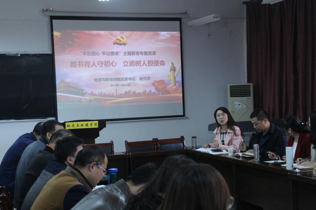 10月30日下午4点,地环学院党委书记赵雪萍在临潼校区骊山校园地环学院报告厅讲授了题为“教书育人守初心,立德树人担使命”的“不忘初心、牢记使命”主题教育党课。赵雪萍从“明确开展主题教育的意义、总体要求和目标任务;高校共产党员的初心和使命;几点希望与要求”等三个方面给广大党员作了一场生动的主题教育报告。地环学院40余名党员聆听了报告会。