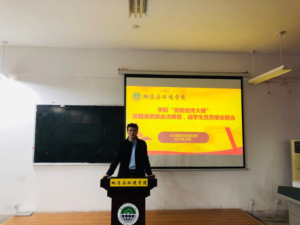 10月17日,地环学院2016级本科生党支部在临潼校区骊山校园11教322集中开展扶贫日主题活动之学院“资助宣传大使”谈精准资助走访感受,话学生党员使命担当座谈会,支部全体党员共计54人参加,会议由支部书记桓斌斌主持。