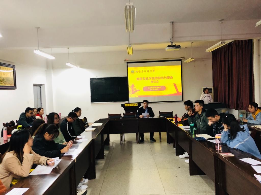 10月18日,地环学院2016级本科生党支部在临潼校区骊山校园11教322集中开展地质专业学生的担当与使命座谈会,支部全体党员共计54人参加,会议由支部书记桓斌斌主持。
