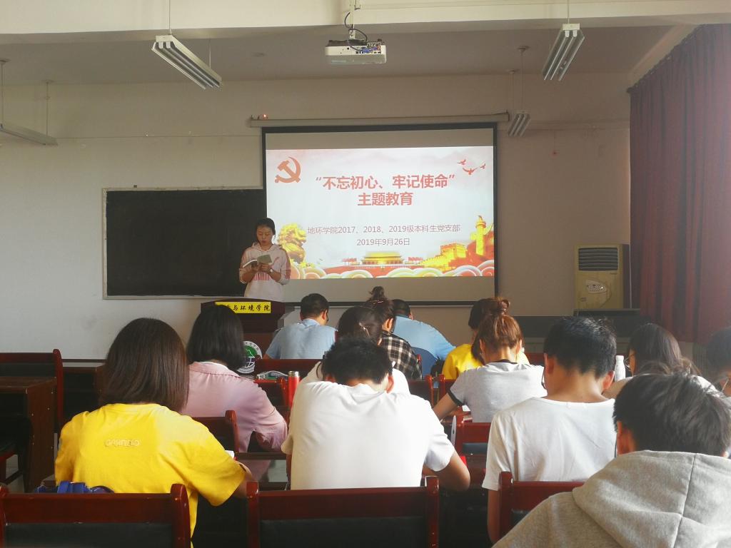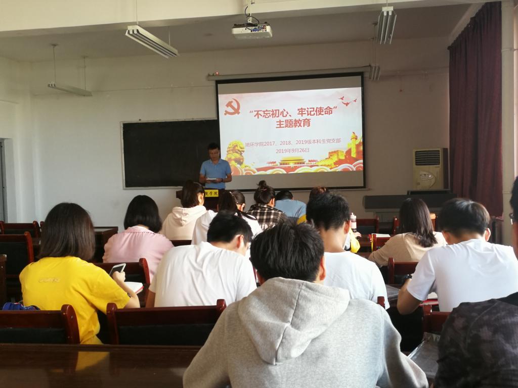 9月26日中午地环学院2017、2018、2019级本科生党支部在临潼校区骊山校园11教322举办“不忘初心、牢记使命”主题教育读书会,支部书记余小涛主持会议。支部党员分别领学《习近平关于“不忘初心、牢记使命”论述摘编》,会后支部党员进行了交流,大家纷纷表示会不忘入党初心,牢记使命,会认真结合日常学习、生活,在学懂、弄通、做实上下功夫,讲奉献、敢担当,在学生中起模范带头作用。支部书记余小涛要求全体党员坚持读原著、学原文、悟原理,认真研读《习近平关于“不忘初心、牢记使命”论述摘编》,扎实开展“不忘初心、牢记使命”主题教育,将教育实效落实到日常工作、学习、生活中。