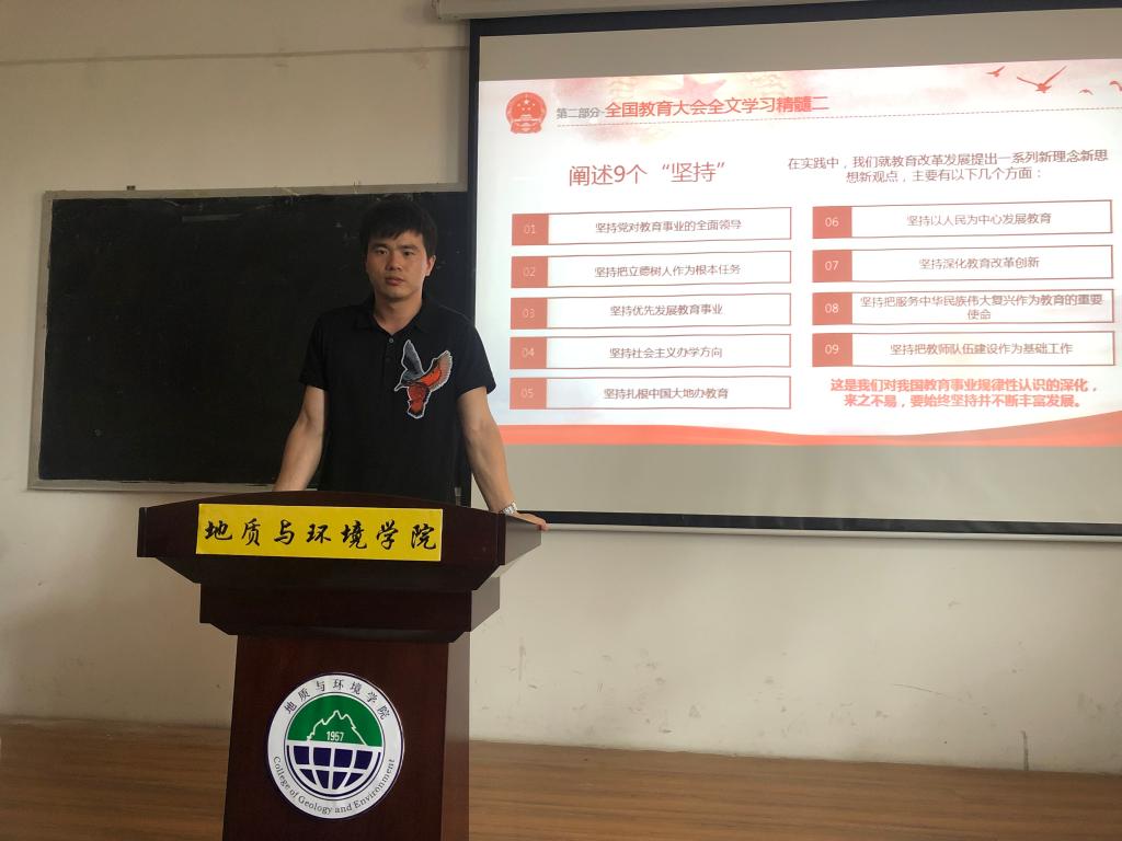 为深入学习宣传贯彻全国教育大会精神,深刻领会习近平新时代中国特色社会主义思想和关于教育的重要论述,在全校持续营造学习全国教育大会精神的浓厚氛围,推进学校一流本科教育建设,4-5月,地质与环境学院全体学工干部按照“四个一”要求,开展了全国教育大会精神宣讲活动。全体学工干部精心准备宣讲内容,教育学生深刻理解全国教育大会精神,结合校内外案例,引导广大青年学生珍惜青春、不负韶华、牢记使命,坚定“四个自信”,把爱国情、强国志、报国行自觉融入到坚持和发展中国特色社会主义事业中。全体学生受到了良好教育,纷纷表示将继续深刻领会全国教育大会精神,珍惜青春年华,脚踏实地,努力学习,志存高远,以身边先进典型为榜样,肩负起时代赋予的重任,做德智体美劳全面发展的社会主义建设者和接班人。