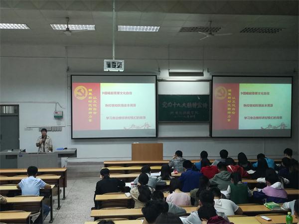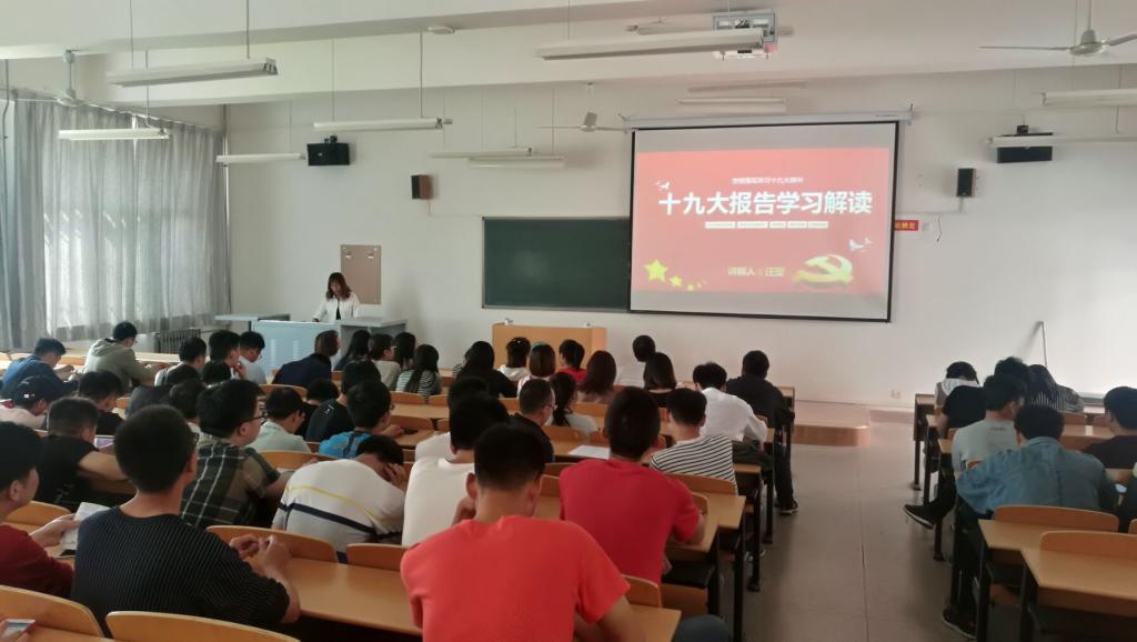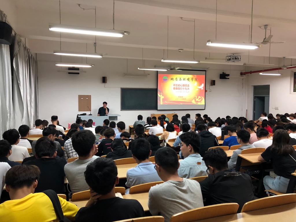 3-4月,地环学院学工干部围绕党的十九大精神主题,结合学生工作实际,按照“四个一”要求,采取讲党课形式开展党的十九大精神宣讲活动。地环学院党委副书记王文莉为全院学生作了题为《学习贯彻党的十九大精神,以文化自信凝聚新时代精神力量》,从中国崛起需要文化自信、熟校情知院情追本溯源、学习身边榜样讲好我们的故事等三个方面展开讲述,向同学们介绍了校情院史,并讲述了地质博物馆四大发现者、地环杰出校友、优秀在校生的先进事迹,要求全体学生学习身边的榜样,讲好地环故事,号召同学们树立文化自信,做有本领、有担当的新时代好青年;院团委书记林伟为团学干部、支部党员、2015级学生作了题为《十九大报告研学及党员如何发挥模范作用》的专题党课,号召学生要自立自强、珍惜当下、努力奋斗,做新时代合格的建设者和可靠接班人;2014级辅导员汪莹、慈继豪分别作了题为《十九大报告学习》、《时不我待、只争朝夕、努力学习、奉献新时代》,号召毕业生发扬艰苦奋斗精神,为新时代奉献自我;研究生辅导员韩蕊为全体研究生讲授了题为《全面解读十九大报告,从“新”出发》的专题党课,强调研究生作为学术氛围营造的生力军,要在学生群体中起到垂范、引领和带动作用,励志为创新型国家的建设做出应有的贡献;2016级辅导员桓斌斌为2016级本科生作了题为《不忘初心跟党走,青春践行十九大》,要求学生不忘初心,牢记使命,用青春书写辉煌;2017级辅导员余小涛为2017级学生作了题为《学习新思想不忘初心,走近新时代牢记使命》的专题党课,结合近五年中国取得的辉煌成就教育广大青年学生不忘初心、刻苦学习、积极践行社会主义核心价值观,为实现中华民族伟大复兴的中国梦而奋斗。此次党课做到了全院学生全覆盖,党课效果良好,进一步加深了同学们对十九大报告精神的领会和学习,同学们纷纷表示,将牢记使命、刻苦奋斗,为祖国繁荣昌盛贡献力量。