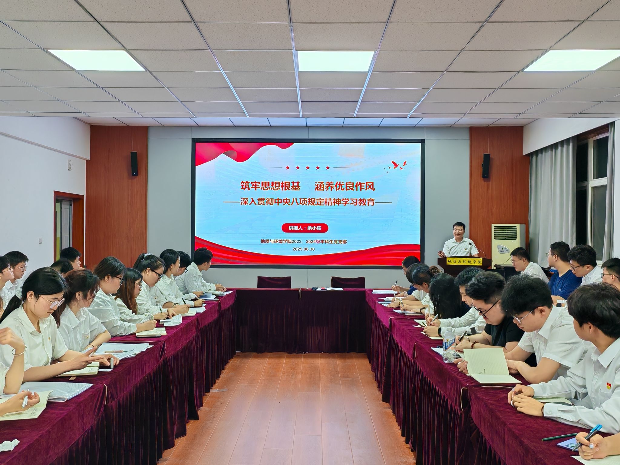 6月30日,学院2022、2024级本科生党支部在骊山校园11教322召开支部大会,支部全体党员参会,支部书记余小涛讲授深入贯彻中央八项规定精神学习教育专题党课。