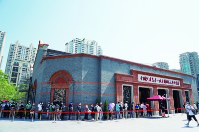 游客在上海中共一大纪念馆前排队等待参观。新华社发