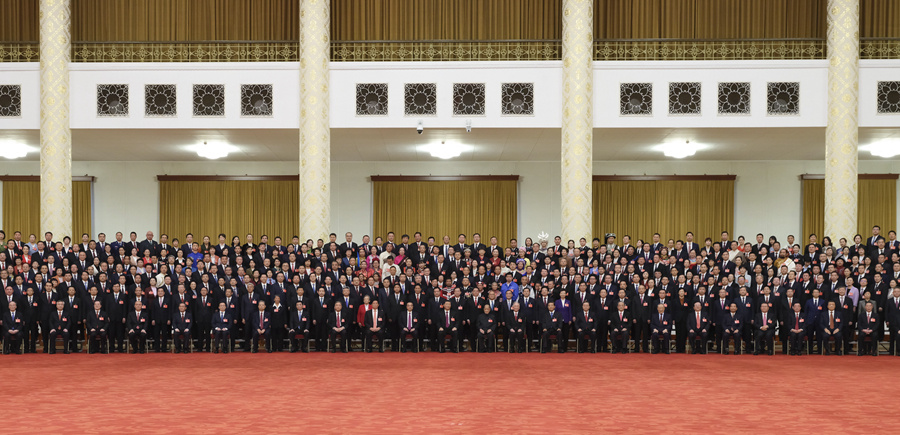 10月23日下午,中共中央总书记、国家主席、中央军委主席习近平等领导同志在北京人民大会堂亲切会见出席党的二十大代表、特邀代表和列席人员,并同大家合影留念。新华社记者 鞠鹏 摄