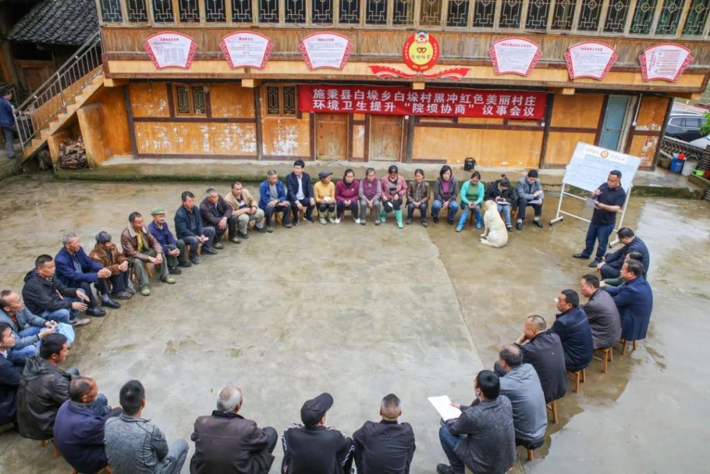 2022年5月23日,在贵州省黔东南苗族侗族自治州施秉县白垛乡白垛村黑冲组,政协委员、村“两委”成员、村民代表围绕美丽村庄环境提升召开院坝协商议事会议。视觉中国供图