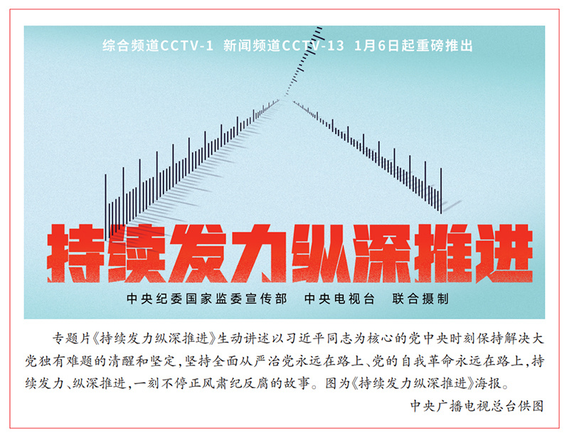 在中宣部指导下,总台与中央纪委国家监委合作,近年来连续推出《红色通缉》《国家监察》《正风反腐就在身边》《零容忍》《永远吹冲锋号》等年度专题片,引起广大受众热评。前不久播出的专题片《持续发力纵深推进》,深度纪实、寓教于事,在总台央视综合频道首播平均收视率1.03%,在自有平台总阅读观看量达38.86亿次,超1300家媒体转载报道,引发社会高度关注。总台将认真总结经验,在更接地气、润物无声上见功力、出实效,深挖中华优秀传统文化这一富矿,推出更多高质量产品,为培育新时代廉洁文化营造良好舆论氛围。