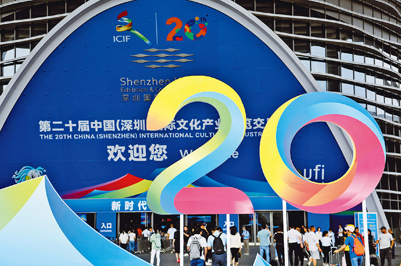2024年5月23日,为期5天的第二十届中国(深圳)国际文化产业博览交易会开幕。本届文博会设8个展馆,共有超6000家政府组团、文化机构和企业参展,展出文化产品超过12万件,4000多个文化产业投融资项目在现场进行展示与交易。图为当日,观众步入第二十届文博会展馆。新华社记者 梁旭/摄
