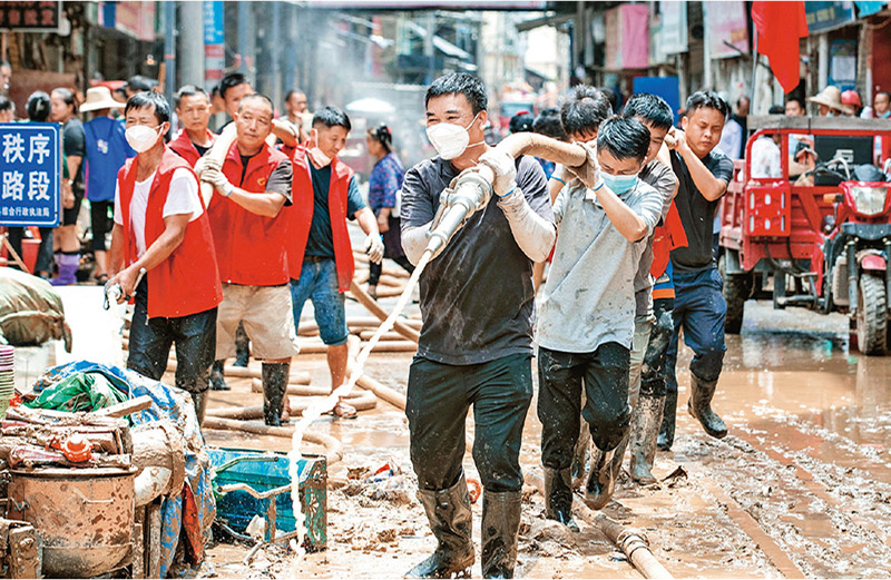 敢于担当作为是中国共产党人一以贯之的优秀品质。图为2025年6月30日,在贵州省从江县丙梅街道俞家湾社区,党员志愿者在参与清淤工作。人民图片 罗京来/摄
