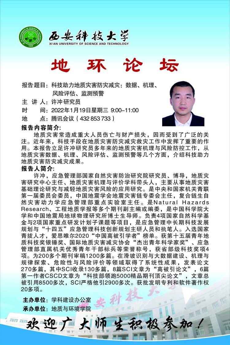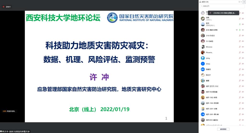 1月19日上午9时,应急管理部国家自然灾害防治研究院许冲研究员应邀做客我院“地环论坛”,做了题为《科技助力地质灾害防灾减灾:数据、机理、风险评估、监测预警》的学术报告,学院赵洲副院长主持,全院近200余名师生线上聆听了报告。