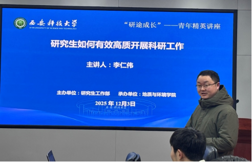 12月3日下午,由党委研究生工作部主办、地质与环境学院承办的“研途成长”专题讲座在雁塔北院煤科楼613会议室顺利举行。学院地质工程系李仁伟老师应邀担任主讲人,以“研究生如何高质量开展科研工作”为题,为全院30余名研究生提供经验分享,讲座由汪莹老师主持。