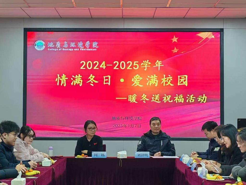 寒假放假前夕,地环学院“情满冬日·爱满校园”暖冬送祝福活动于临潼校区骊山校园11号教学楼322会议室顺利举行。学院党委副书记刘训明、学校资助管理中心主任周杨、学院全体辅导员及受助学生代表齐聚一堂,共同见证这一暖心时刻。活动由学院资助专项工作负责人韩蕊主持。