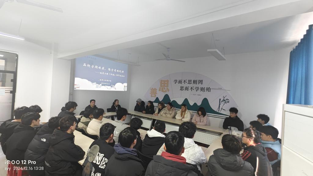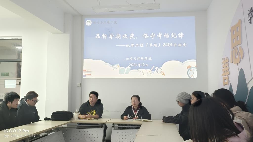 12月13日,地质工程(卓越)2401班班主任唐皓老师深入“一站式”学生社区召开“品析学期收获,恪守考场纪律”主题班会,辅导员李琳和地质工程(卓越)2401班全体学生参会。