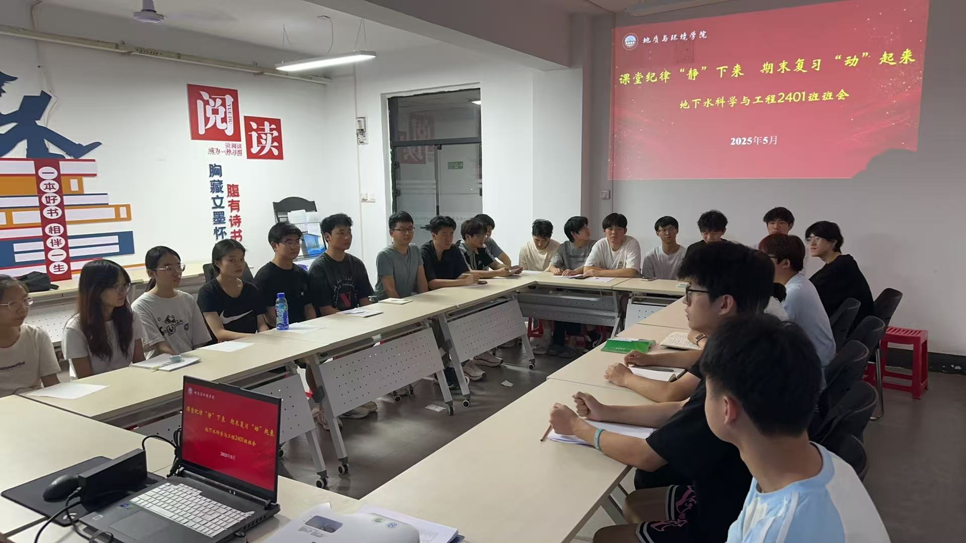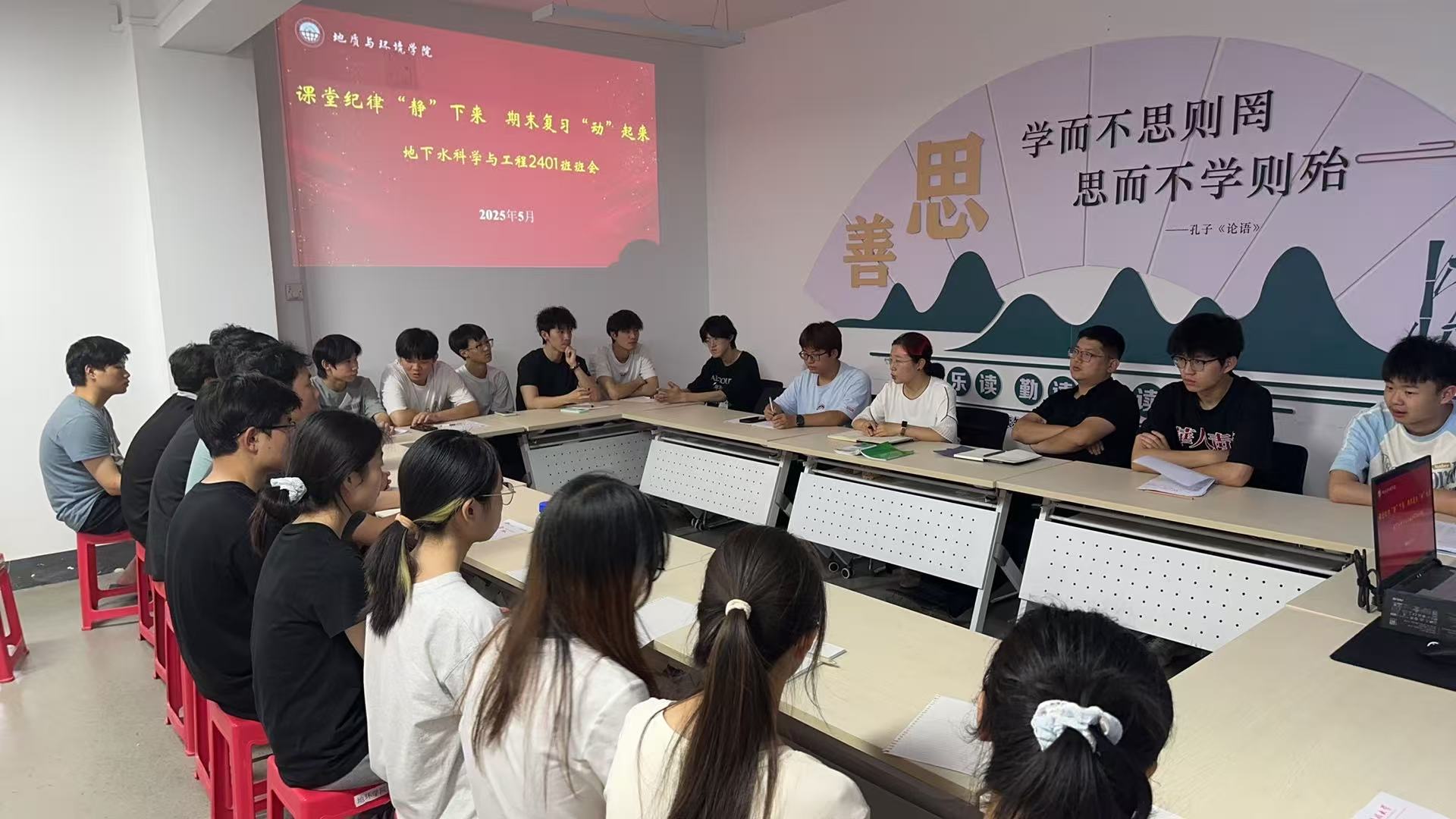为严肃课堂纪律,强化学生规范意识,保障期末学习高效进行,5月21日,地下水科学与工程2401班在“一站式”学生社区召开“课堂纪律‘静’下来,期末复习‘动’起来”主题班会。班主任马稚桐、辅导员李琳及班级全体学生参会。