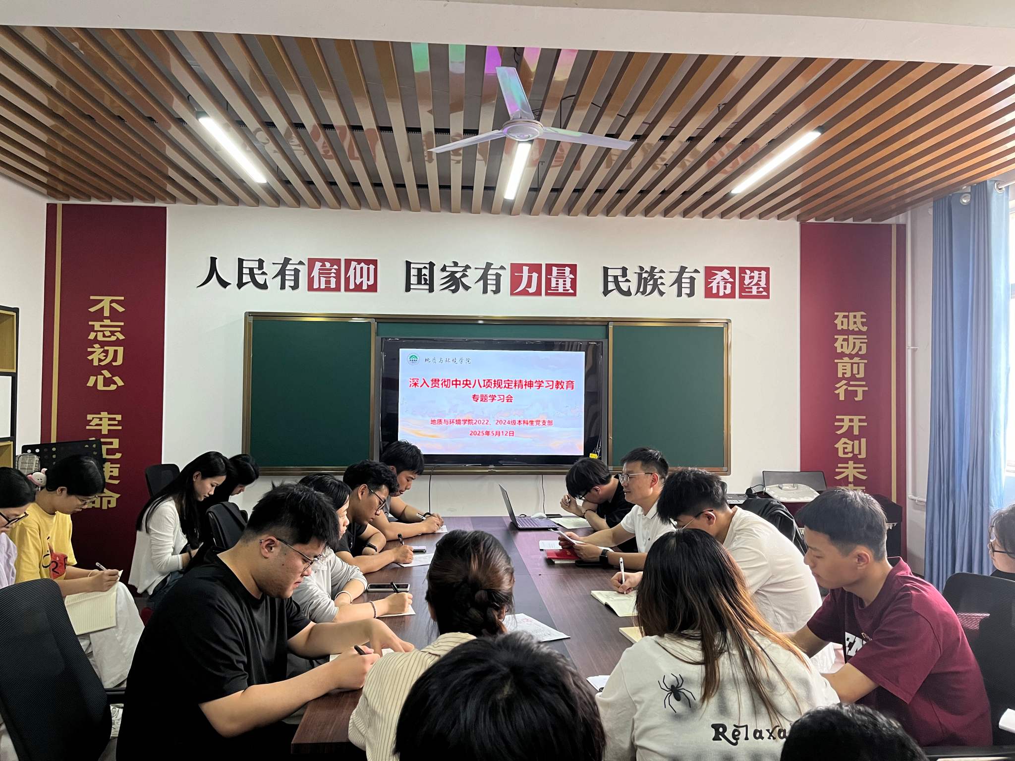 5月12日,学院2022、2024级本科生党支部在“一站式”学生社区召开深入贯彻中央八项规定精神学习教育专题学习会,支部党员参加会议,支部书记余小涛主持会议。