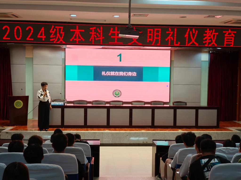 为切实做好学生的文明礼仪教育工作,9 月 22 日,学校特邀专业礼仪讲师在骊山校园图书馆二层报告厅为我院2024级本科生带来了一场意义深远的文明礼仪教育报告会。本次报告会由培训师李萍主讲,学院团委书记兼2024级学生辅导员李琳主持。