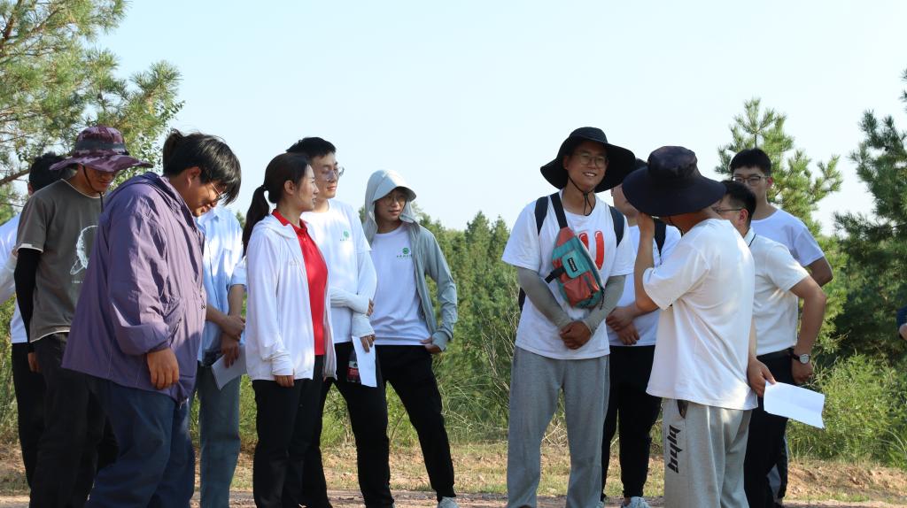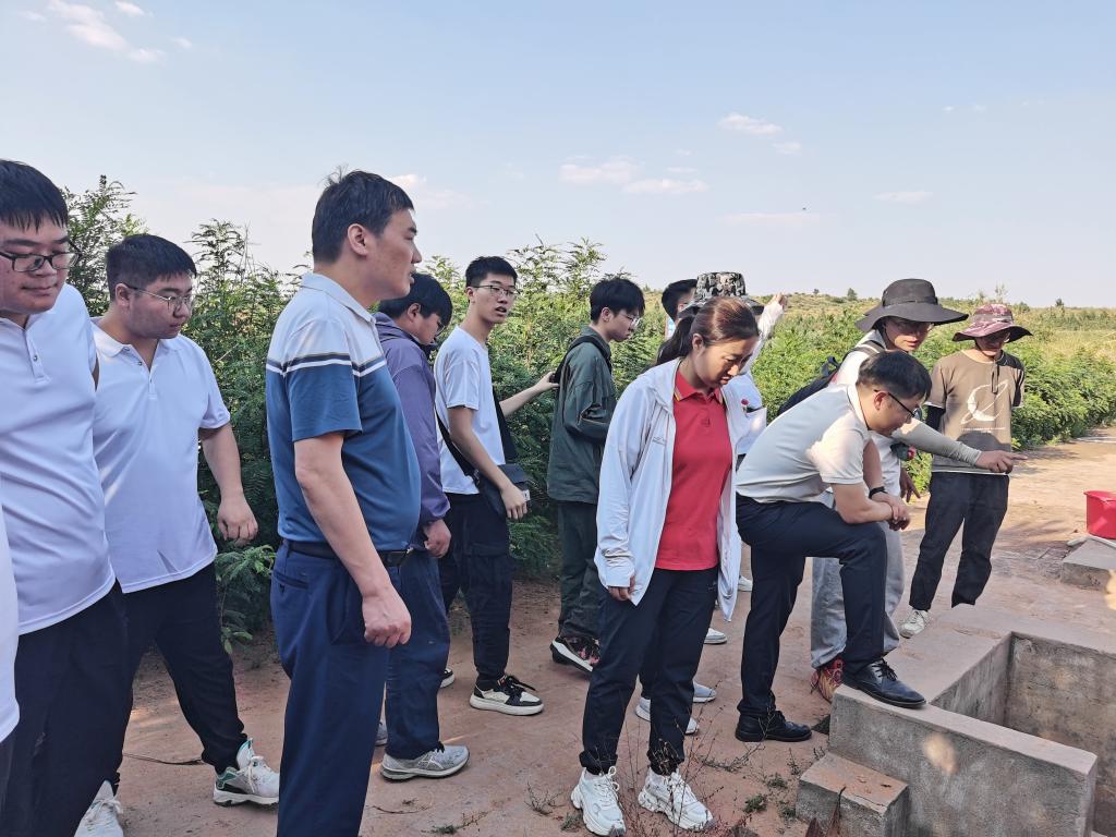 继续向前,微生物复垦田区域块分散在不远处的山坡上,截排水沟坐落于起伏的山垅,樟子松、紫穗槐等固沙植物亦密集地分布于鱼鳞坑整地里……在课题组同学的介绍下,实践团师生对矿区生态修复治理充满了好奇与希望。
