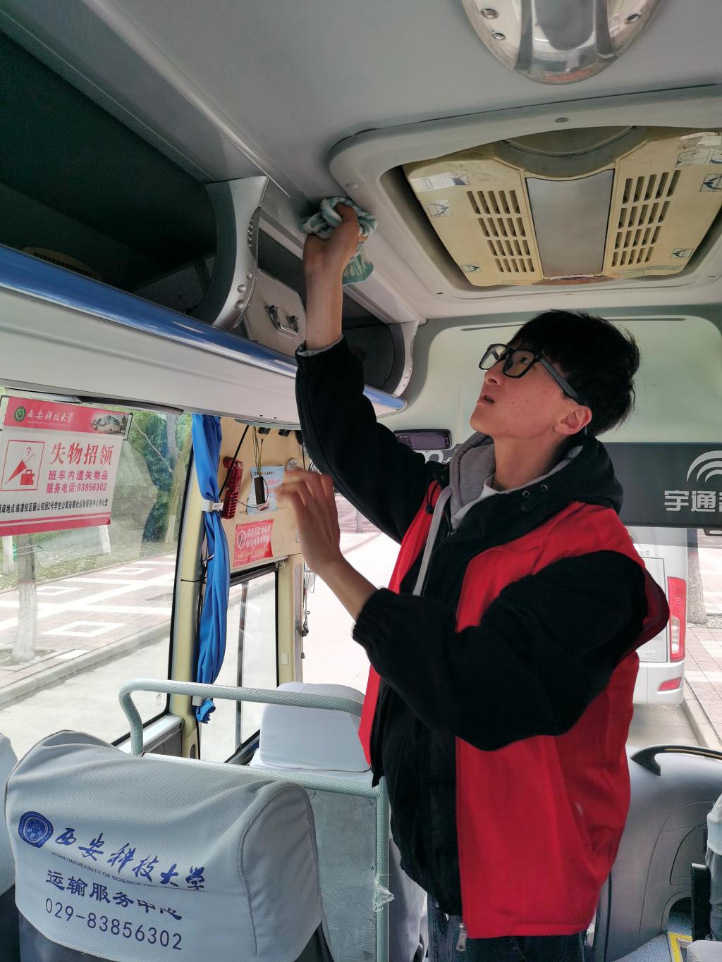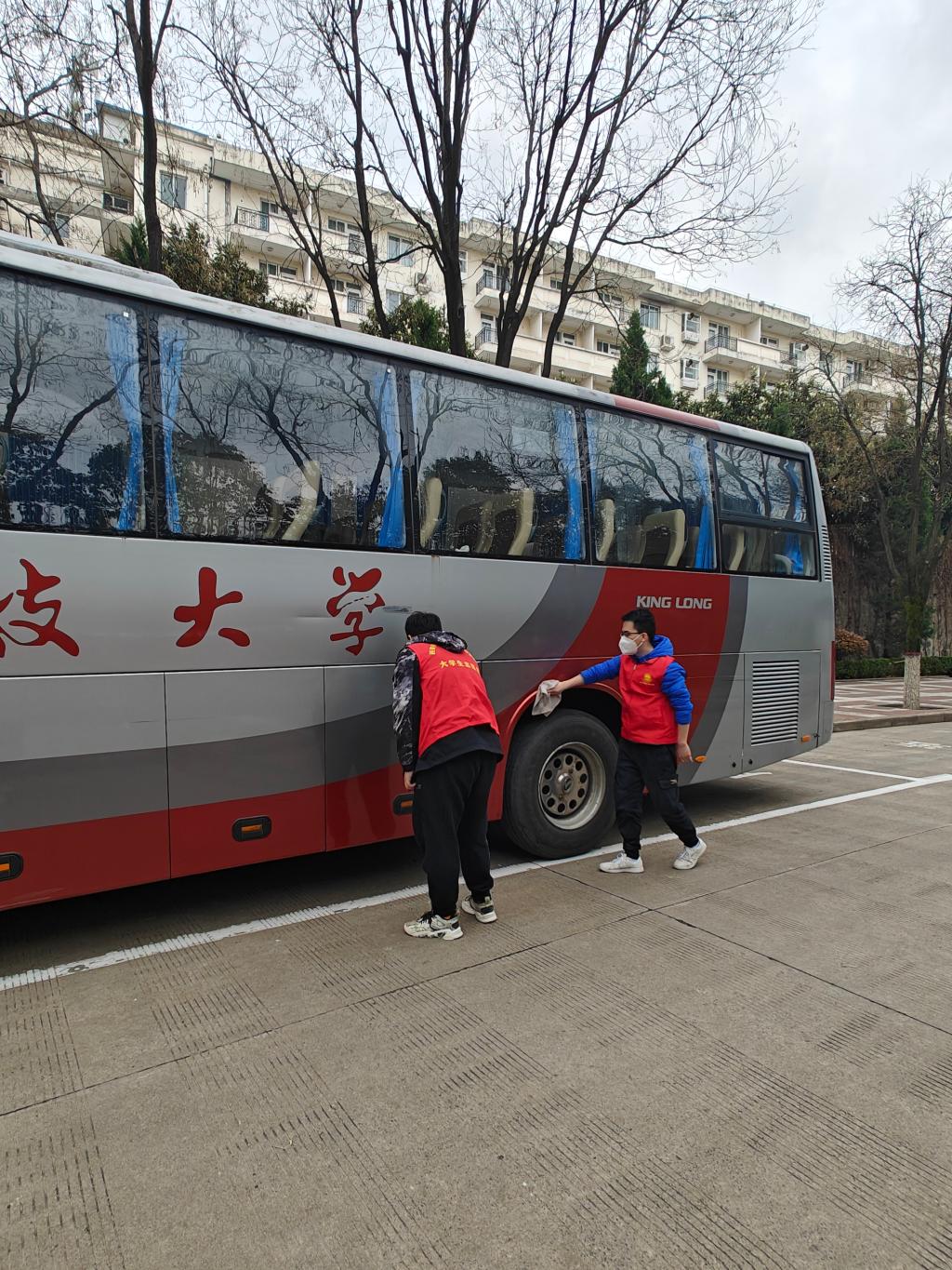 团支部16名同学分成3组,分别对4辆校车进行了彻底的打扫。经过两个小时的努力,校车焕然一新。