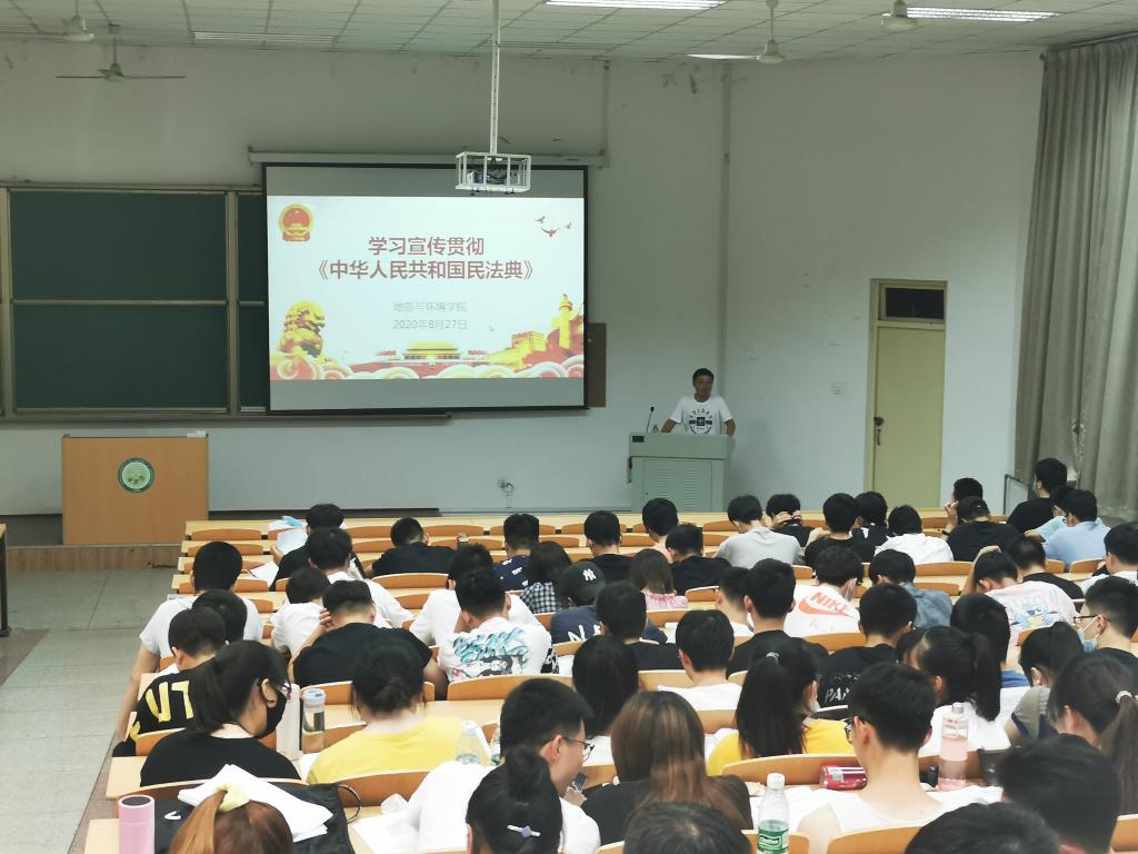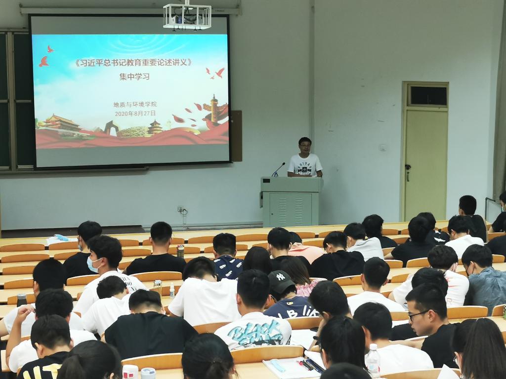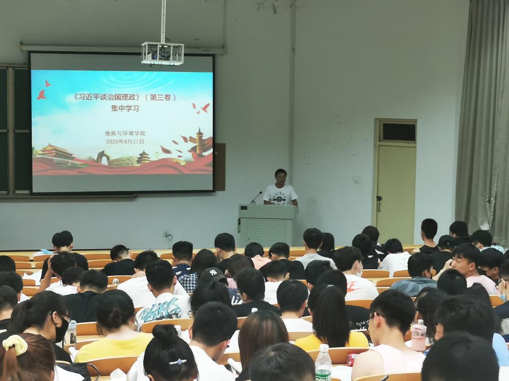 8月27日,地环学院在临潼校区骊山校园9教101教室召开2017级本科生年级大会,辅导员余小涛组织2017级本科生集中学习《中华人民共和国民法典》《习近平谈治国理政》(第三卷)、《习近平总书记教育重要论述讲义》、“西迁精神”等部分内容,他向学生说明了学习这些知识的重要意义,提出了学习要求,要求各班利用主题班会、团日活动等方式加强学习,丰富学习教育形式,将学习内容转化为内在动力,融会贯通到日常学习生活中,为学校各项事业贡献力量,为实现中华民族伟大复兴的中国梦而不懈奋斗。