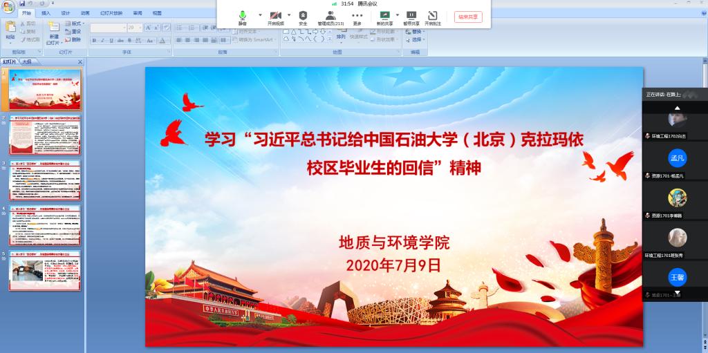 7月7日习近平总书记给中国石油大学(北京)克拉玛依校区毕业生的回信引发强烈反响。7月9日地环学院组织2017级本科生深入学习回信内容,2017级辅导员余小涛领学了总书记回信内容,他表示,总书记的回信对广大毕业生提出了殷切希望,他要求2017级本科生在就业工作上早做谋划,认真准备简历,提高求职技能,做好职业生涯规划,牢记总书记嘱托,志存高远,脚踏实地,鼓励学生扎根西部建设,到祖国最需要的地方建功立业。同学们纷纷表示,总书记的回信既是鼓励又是鞭策,这些奔赴基层工作的高校毕业生正是他们学习的榜样,新冠肺炎疫情对就业有一定影响,但大家会积极应对,提高自身综合能力,牢记“祖国利益高于一切”的校训,胸怀理想、志存高远,勇担时代使命,积极响应党和国家的号召,扎实学好本领,到祖国最需要的地方放飞青春梦想、书写人生华章,将来以自己所学为祖国建设事业,为实现中华民族伟大复兴的中国梦贡献自己的力量。