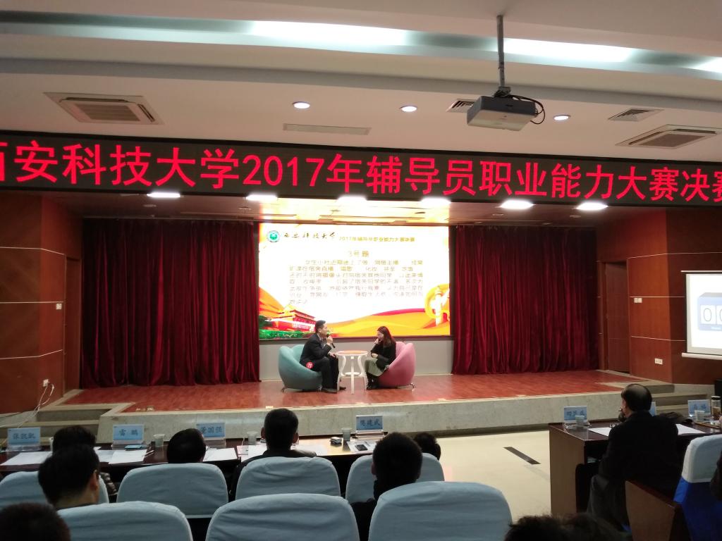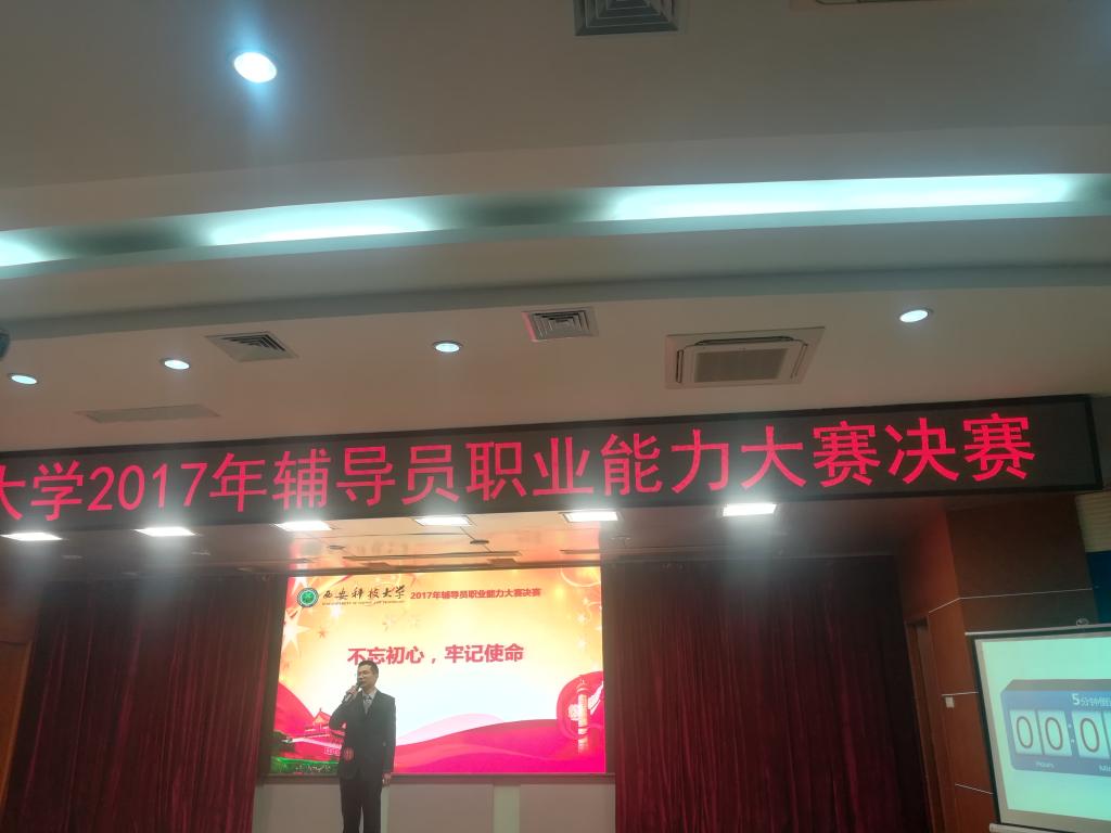 12月28日下午,西安科技大学2017年辅导员职业能力大赛决赛在临潼校区骊山校园图书馆报告厅举行。经过前期笔试、案例分析、主题班会、主题演讲等环节,我院辅导员林伟进入决赛谈心谈话环节,经过激烈角逐,辅导员林伟荣获我校2017年辅导员职业能力大赛二等奖和谈心谈话环节单项奖。另外,我院辅导员汪莹荣获我校2017年辅导员职业能力大赛优秀奖。