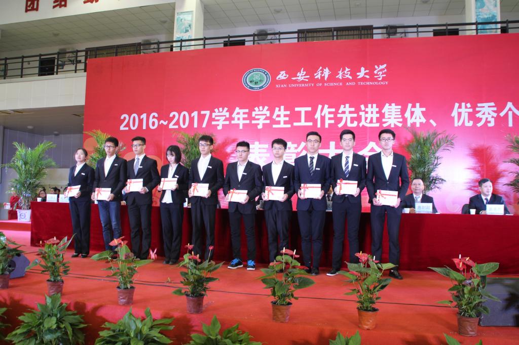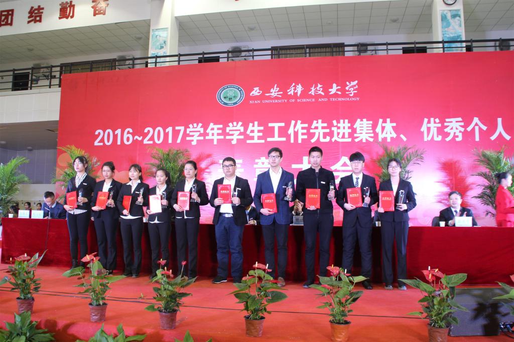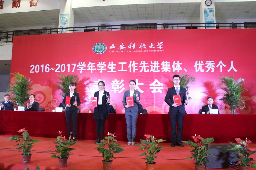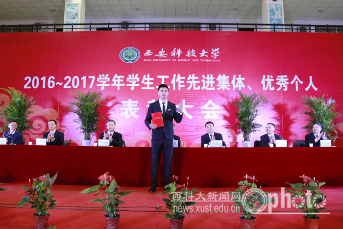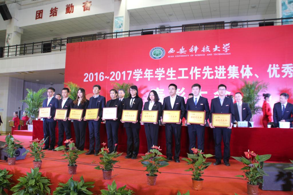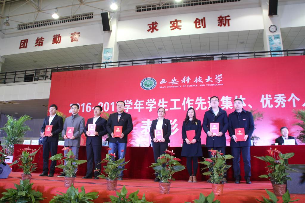 12月7日下午,西安科技大学2016~2017学年学生工作先进集体、优秀个人表彰大会在临潼校区骊山校园体育馆隆重举行。校长蒋林,党委副书记樊建武,副校长李树刚、惠朝阳、王贵荣,总会计师黄英维出席大会并向受表彰的先进集体和优秀个人代表颁奖。地环学院多名师生受到表彰,表彰了“学生特色党支部”1个、先进班集体4个、学生会先进部门3个等先进集体和孙越崎奖学金获得者陈新、三好学生标兵陈新、优秀学生干部标兵韩雪、三好优秀生陈鹏等、精神文明奖白永皓、优秀辅导员慈继豪、优秀班主任陈跃等先进个人。其中精神文明奖获得者白永皓为全校学生中唯一获得此项殊荣的学生。