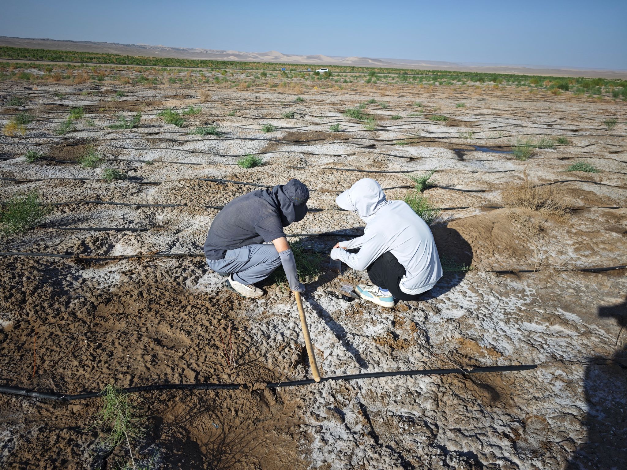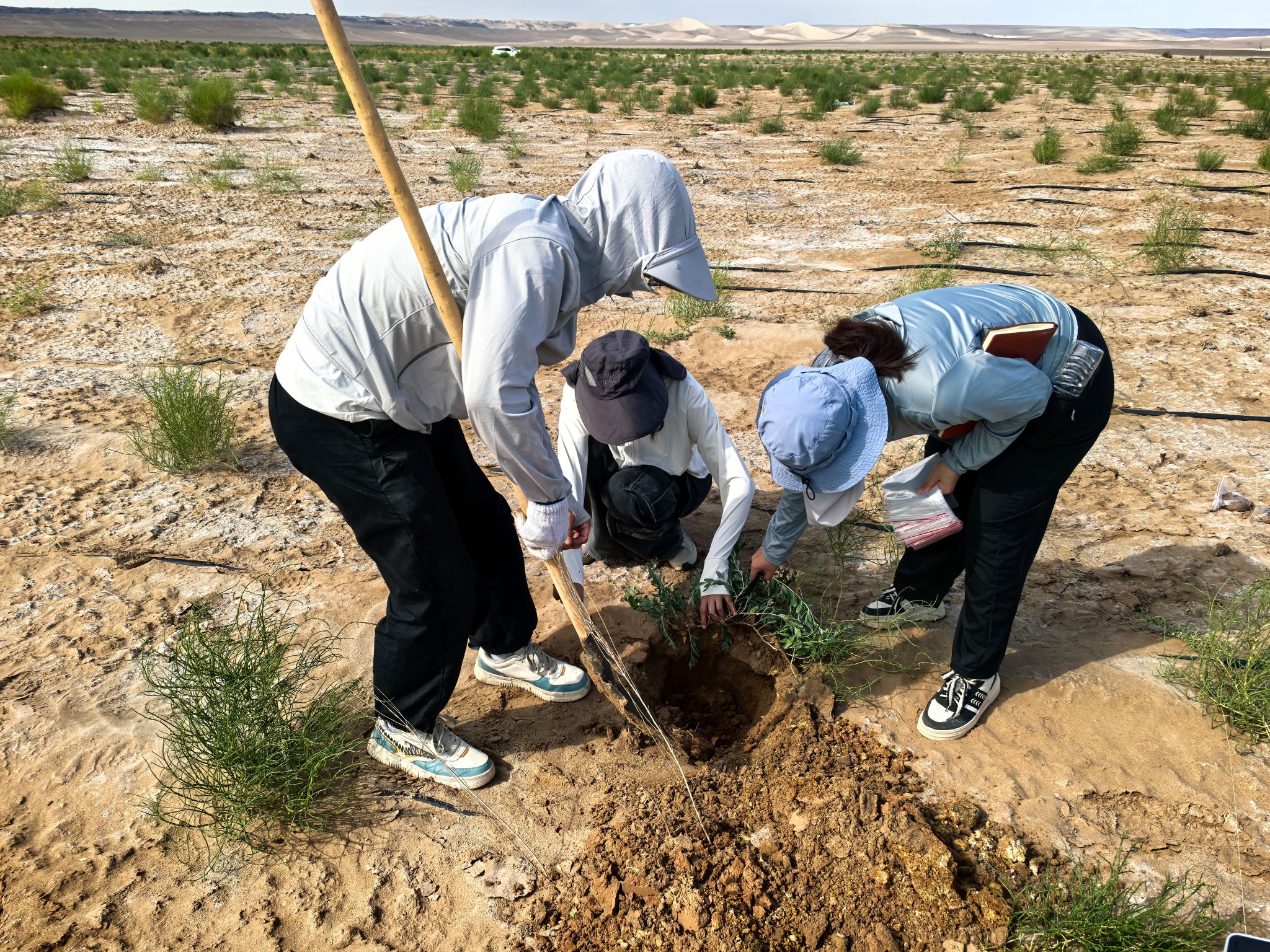8月6日至8月11日,实践团还前往哈密市徐矿集团哈密能源有限公司矿区,对 3000 亩哈密高盐渍区高盐矿井水绿化造林试验项目进行调研。期间,团队深入探究了高盐矿井水造林的植被生长情况,系统学习了植被生长监测与土壤样品采集的相关方法,并聆听了该项目的发展历史,不仅对当地矿井水造林的开发历程有了进一步认识,也对生态修复有了直观体验。