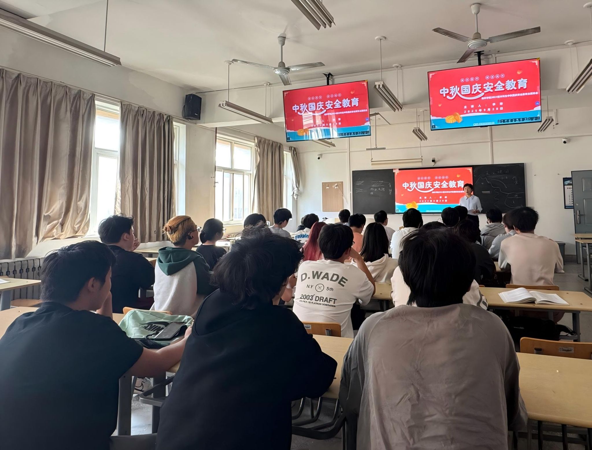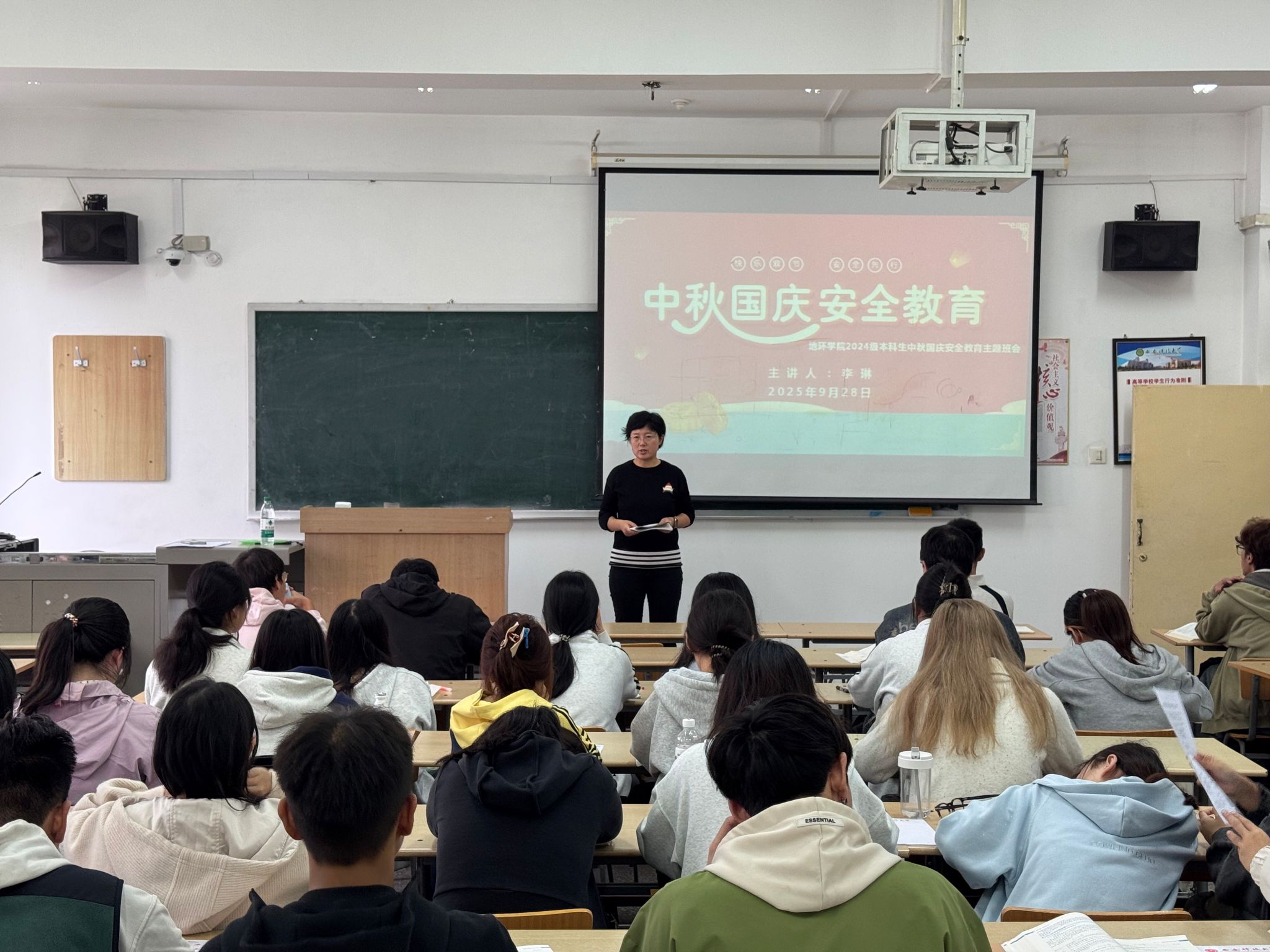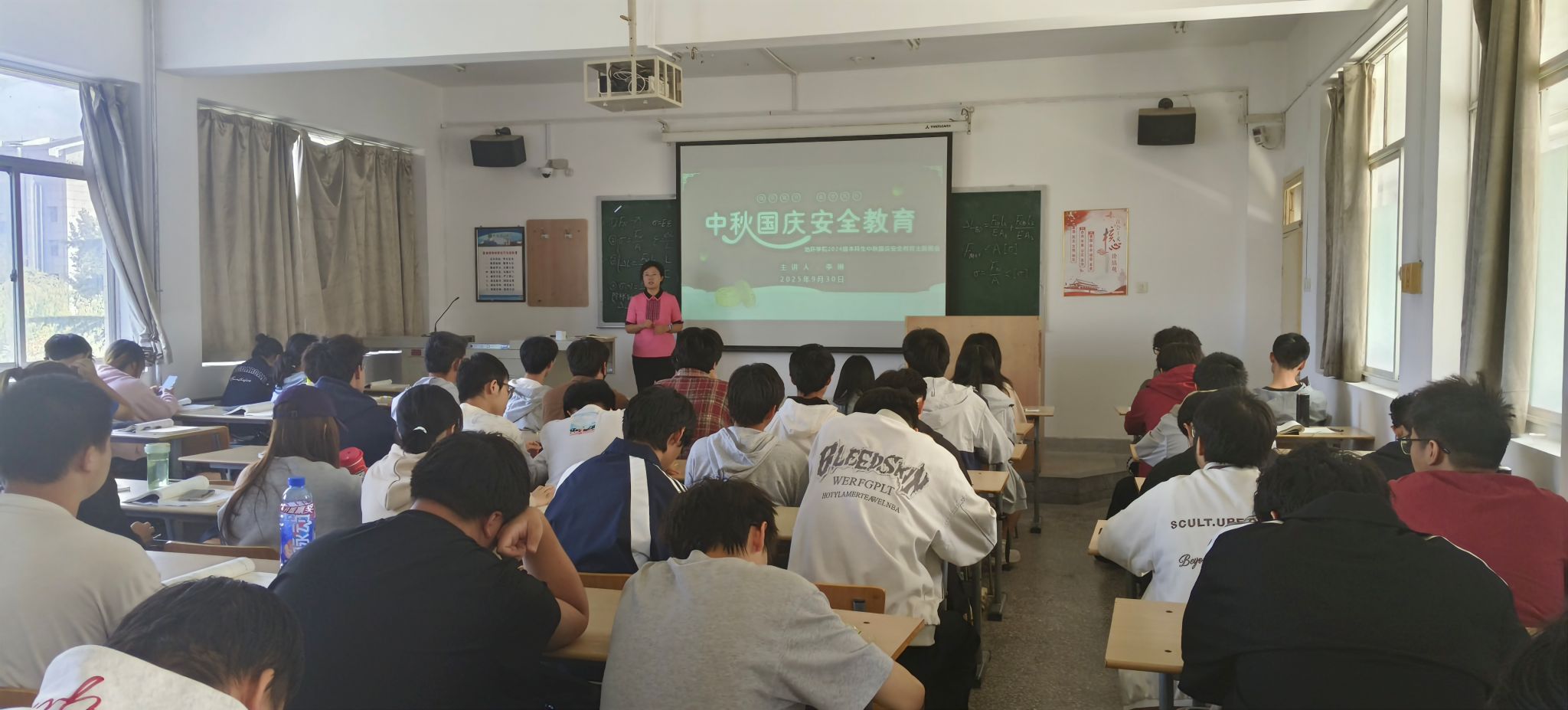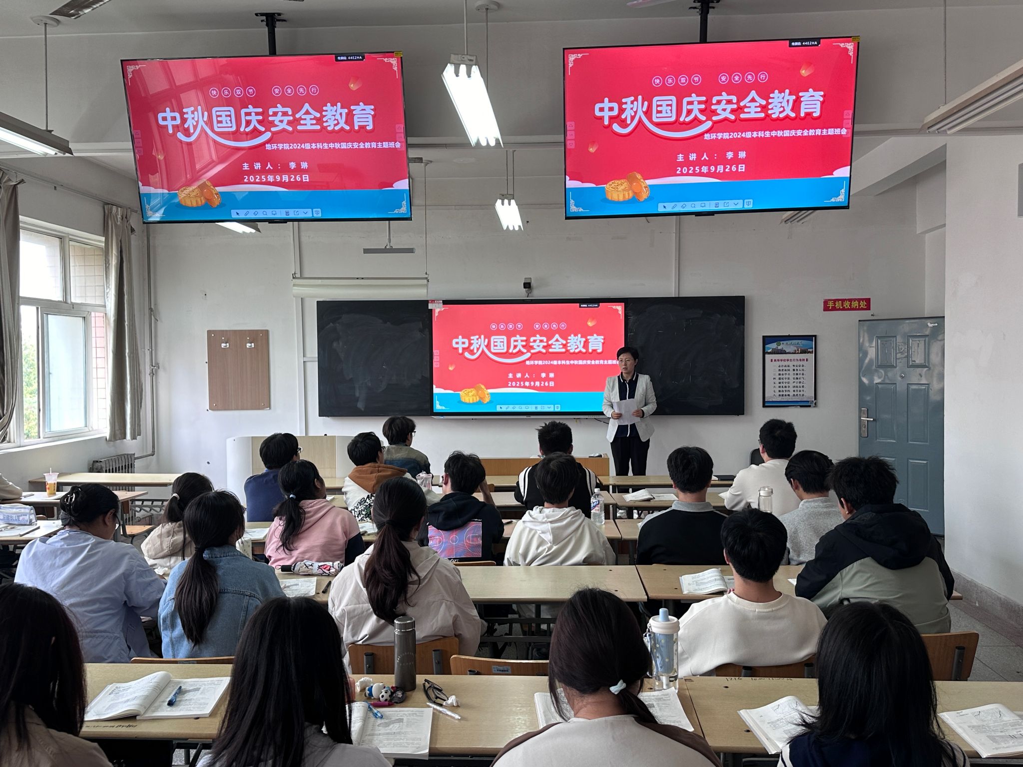 国庆中秋双节临近,为守护2024级本科生假期安全,9月26日至30日,学院学工办主任、2024级辅导员李琳分批次在1教413、1教505、11教501等教室,为9个班级开展假期安全教育主题班会,从七大维度送上“安全锦囊”。