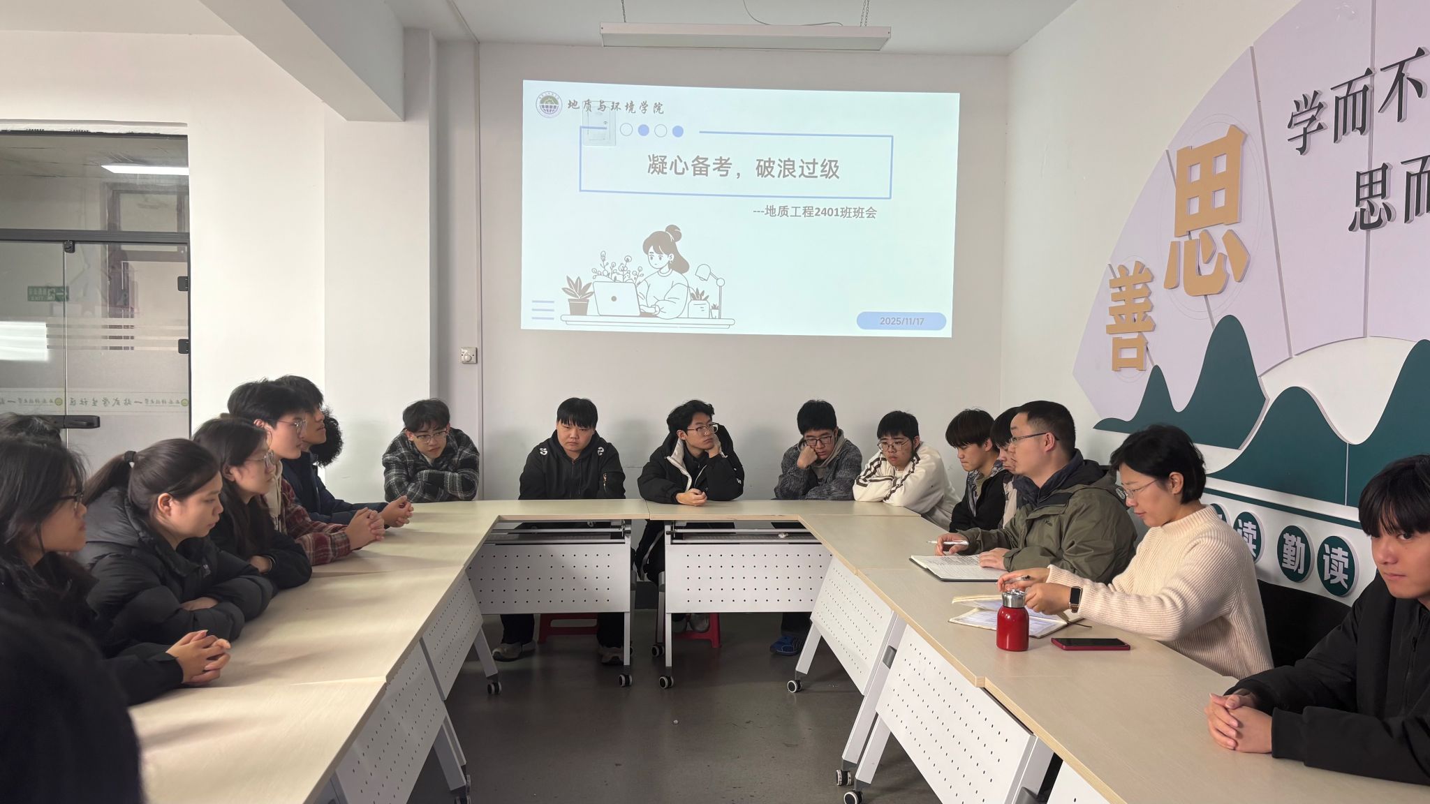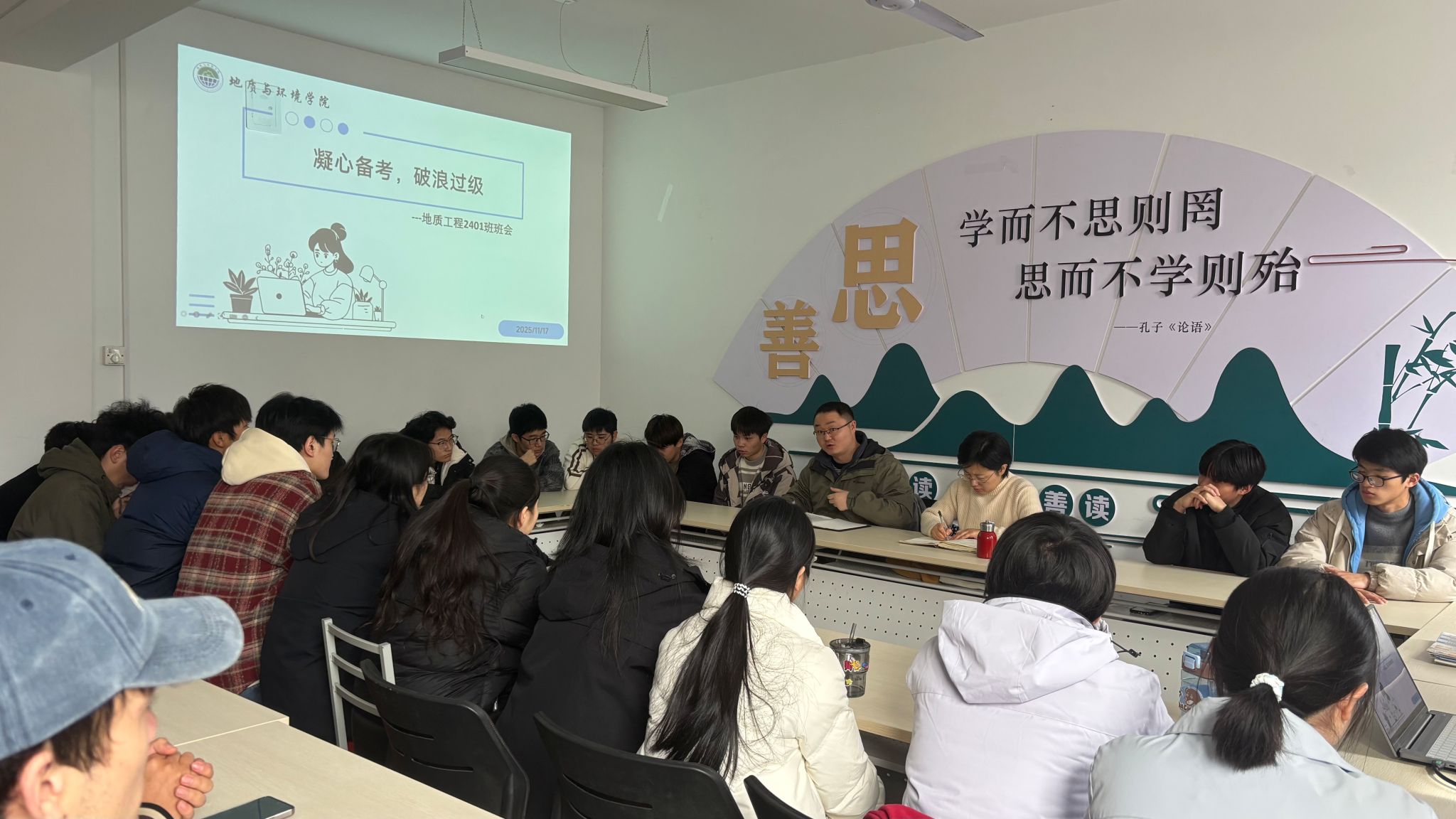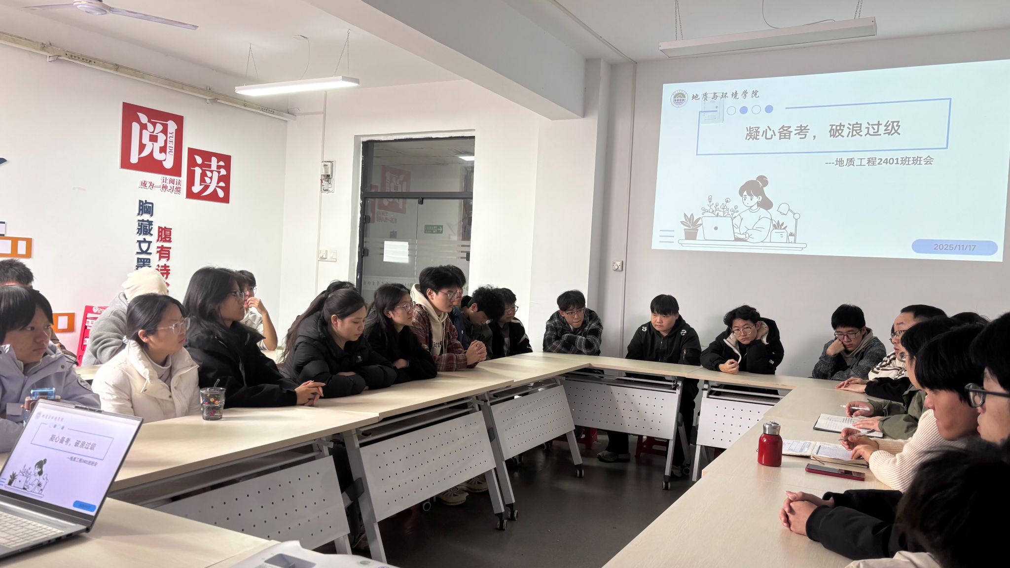 为帮助同学们高效备战英语四级考试,明确备考方向、掌握实用技巧,11月17日,地质工程2401班在“一站式”学生社区召开“凝心备考,破浪过级”主题班会。班主任李仁伟主持,辅导员李琳及全体同学参会。