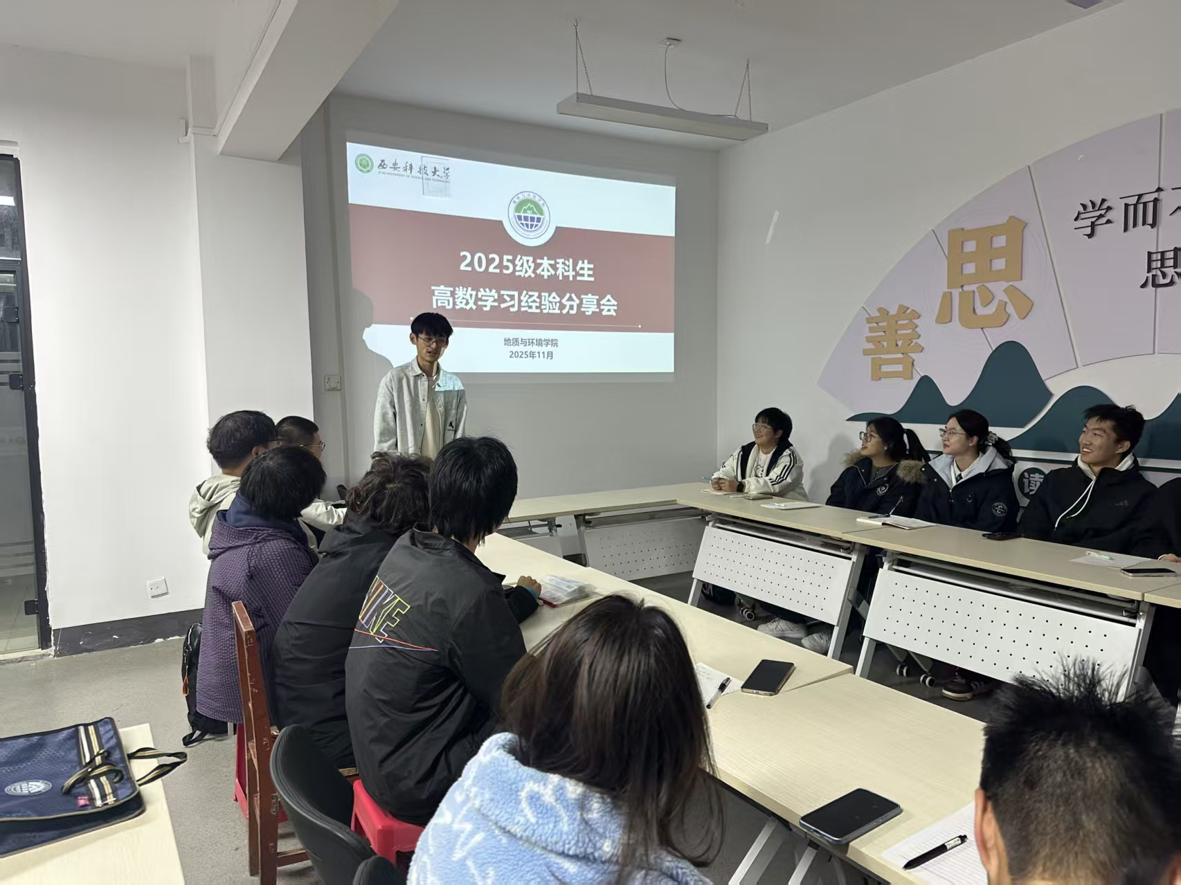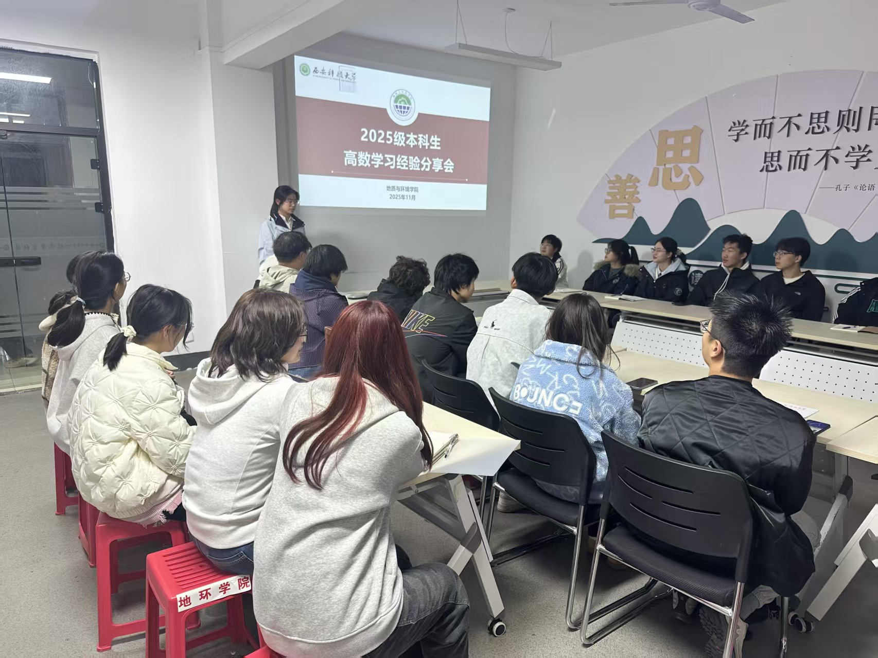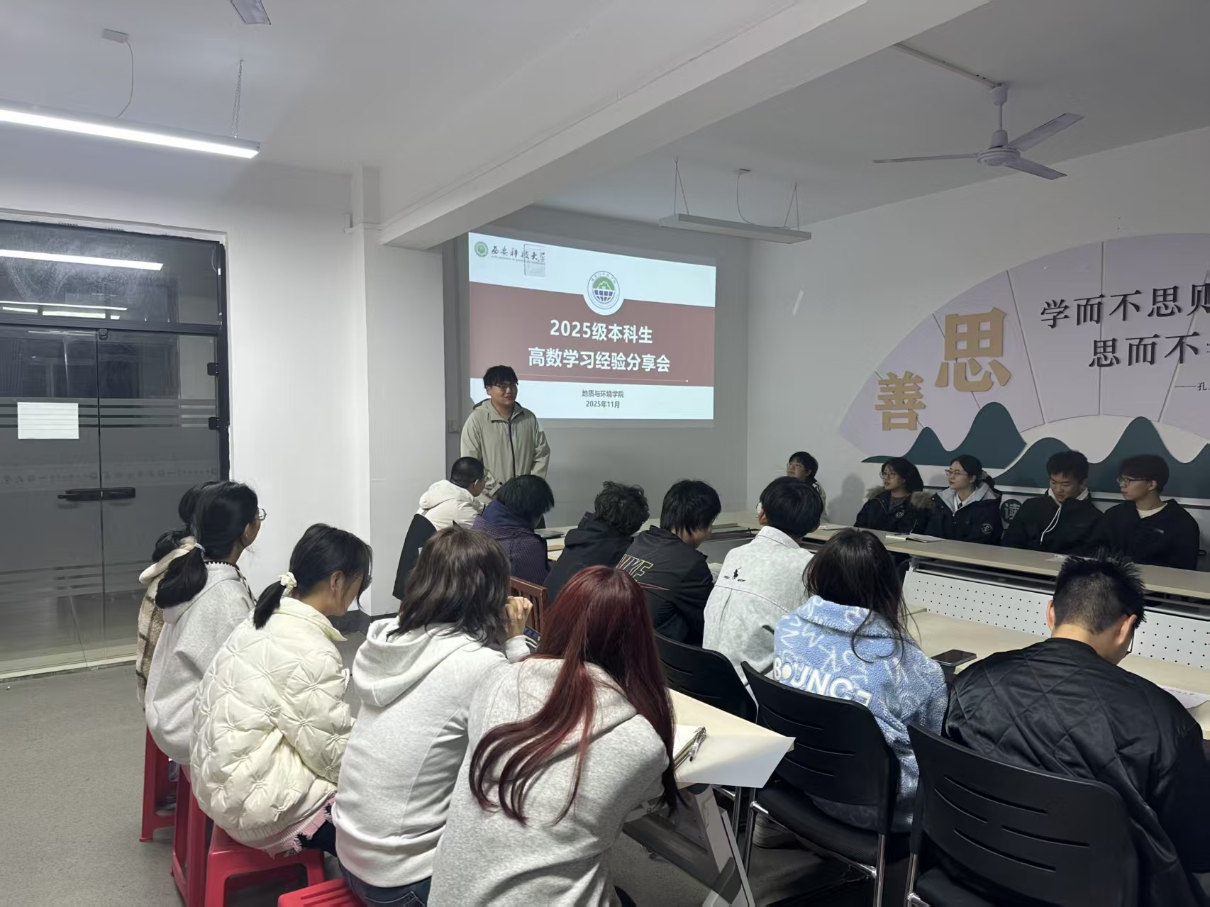 为营造严谨笃学、互促共进的优良学风,助力2025级新生攻克高等数学学习难点,掌握科学有效的学习方法,11月25日,学院于“一站式”学生社区举办了2025级高等数学学习经验分享会。本次分享会特邀在近期章节测试中取得优异成绩的2025级学生代表高雪棋、程可心、夏宇龙、韩贝、韩梓萌担任主讲,2025级辅导员周佳瑞主持,2025级学生代表参会。