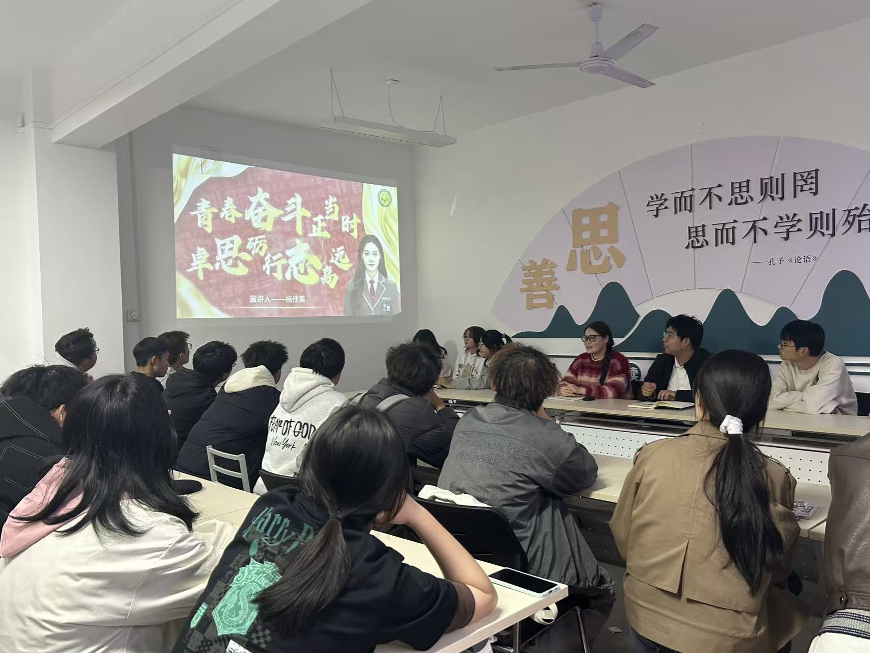 为加强学风建设,发挥榜样示范作用,引导2025级新生科学规划大学生涯,11月12日,学院在“一站式”学生社区组织召开“学涯新启航,薪火代相传”优秀学子分享会。辅导员周佳瑞主持,特邀2025届优秀毕业论文获得者、张伯声奖二等奖获得者、已推免至本校攻读硕士研究生的杨佳美同学进行专题分享,2025级本科生代表参加。