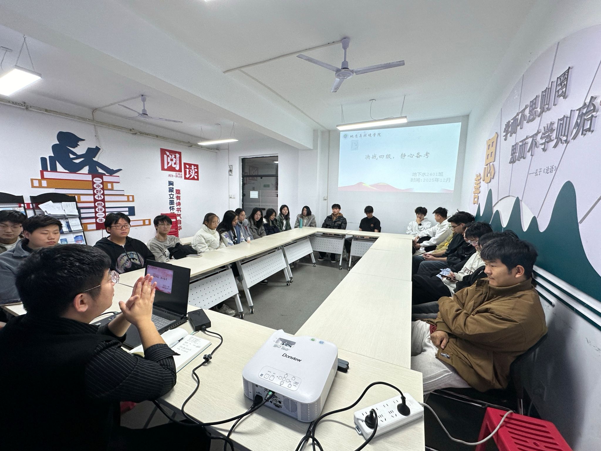 马稚桐结合英语学习经验,给出“基础夯实—专项突破—模拟冲刺”的三段式四级备考规划,助力同学们避开复习盲区、提升应试效率。同时,针对期末备考,班主任结合地下水科学与工程专业课程特点,拆解专业课、公共课的复习重点与核心考点,分享“知识点体系化梳理+重难点专项突破”的期末复习方法,明确“考点梳理—强化巩固—查漏补缺”的备考路径,帮助同学们根据学科与自身特点制定针对性复习方案,积极树立“以学迎考、备考促学”的意识。