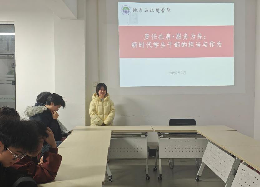 为强化学生干部服务意识,3月20日,学院在“一站式”学生社区开展“责任在肩,服务为先”主题培训,学院各学生组织、班级学生干部代表参与,优秀学生干部、环境工程2303班晁晶晶作为主讲进行分享。