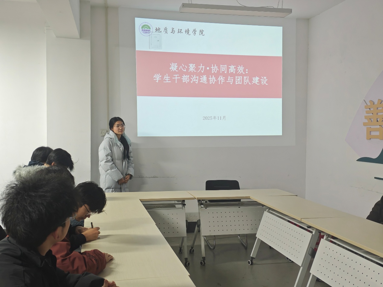 资源勘查工程2302班党丽媛聚焦学生干部在团队沟通、协作配合中常见的问题,通过理论讲解、案例分析等方式,系统阐述了高效沟通的技巧与团队建设的核心要点。参训学生干部结合自身工作经历,分享了团队协作中的经验与困惑,并在互动讨论中积极探索解决问题的方法,进一步深化了对团队协作重要性的认知。