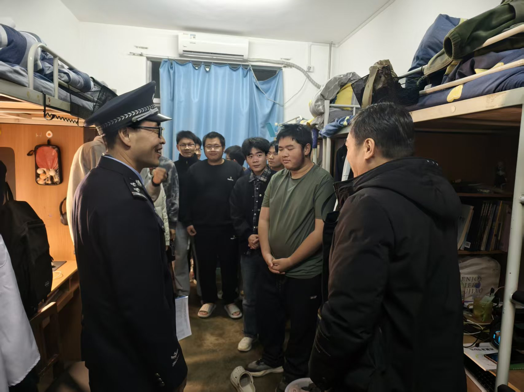活动第二阶段,学院党委副书记刘训明、全体辅导员与民警一同深入学生宿舍,开展“一站式”社区面对面反诈宣传。他们走进学生中间,亲切询问同学们日常网络消费、社交软件使用等情况,结合不同年级学生的生活学习特点进行针对性提醒,告诫大家务必警惕不明链接、虚假兼职广告、冒充熟人借款等常见陷阱。宣传人员还现场发放了反诈宣传单,并耐心指导同学们下载、注册和正确使用“国家反诈中心”APP,详细讲解其来电预警、风险查询、线索举报等实用功能,确保反诈工具落到实处、发挥实效。