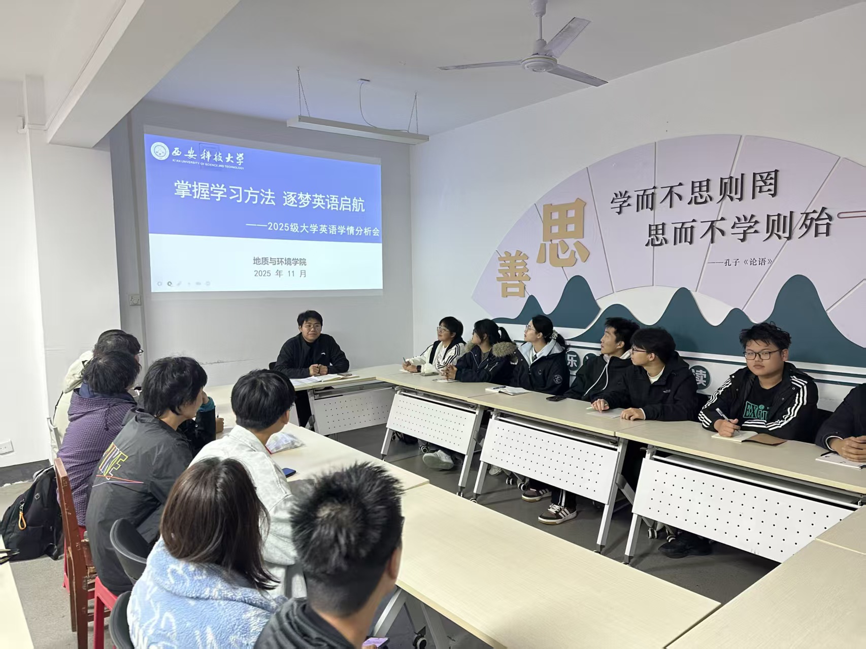 会上,辅导员周佳瑞首先对2025级学生进入大学以来英语学习的整体情况进行了通报与初步分析。他结合开学以来的课堂观察、作业反馈、单元测验数据以及日常与同学们的交流,对当前年级英语学习的总体氛围、普遍性优势及暴露出的共性难点进行了梳理。周佳瑞指出,大部分同学学习态度端正,能较好适应大学英语教学节奏,但在词汇的长效积累、听力理解与口语表达的自信心、以及从应试到应用的能力转换等方面,仍需付出更多努力。