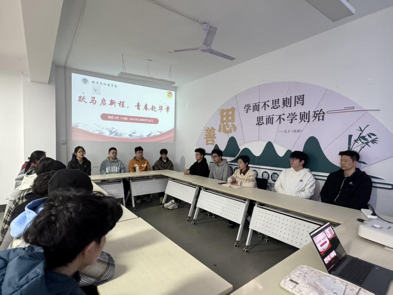 为深入学习贯彻习近平新时代中国特色社会主义思想,推动团员和青年主题教育走深走实、落地见效,近日,地质工程(卓越)2401团支部在“一站式”学生社区,召开“跃马启新程,青春赴华章”专题组织生活会。学院团委书记李琳及支部全体团员参会。