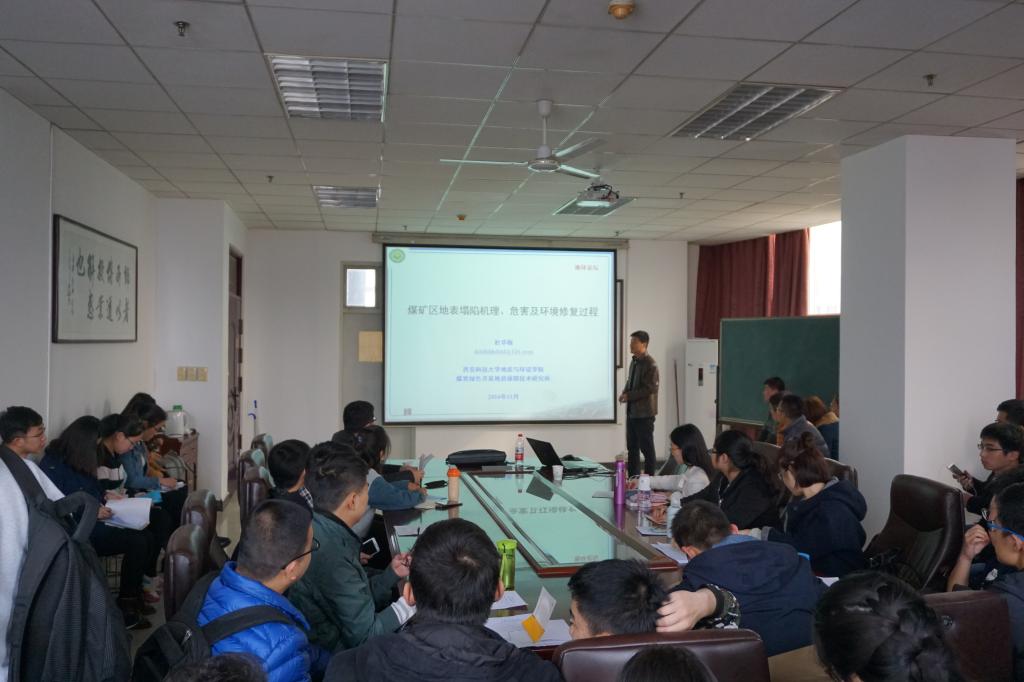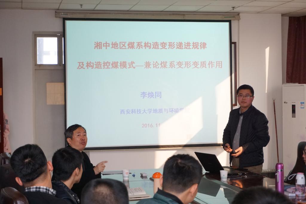 本次学术报告会分为两个环节,首先由杜华栋老师作关于“煤矿区地表沉陷机理、危害及生态环境修复过程”的学术报告,分别从煤矿区地表沉陷现状、产生机理以及生态修复过程向在场研究生作了详细的阐述。随后,李焕同老师通过介绍湘中地区地形地势以及煤系变形变质作用机理并结合近几年来数据,深入浅出地向大家讲授了“湘中地区煤系构造变形递进规律及构造控煤模式”这一选题。第二环节为师生互动环节,两位老师分别对在场研究生的提问进行耐心的解答,博得大家的阵阵掌声。最后,由唐院长进行总结发言,对两位老师作出精彩的报告表示感谢,并鼓励所有研究生在今后的学习生活中积极交流共同进步。