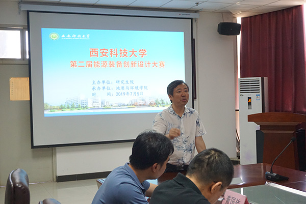 7月5日,我校第二届研究生能源装备创新设计大赛决赛在雁塔校区煤科大楼613会议室举行,研究生院及相关学院分管研究生工作副院长、导师代表、研究生代表观看了比赛,本次比赛由研究生院主办,地质与环境学院承办。比赛开始前由研究生院副院长李成峰老师致词,地环学院党委书记赵雪萍老师对进入决赛的选手表示祝贺,地环学院副院长唐胜利老师介绍本次大赛筹备情况及评分规则。