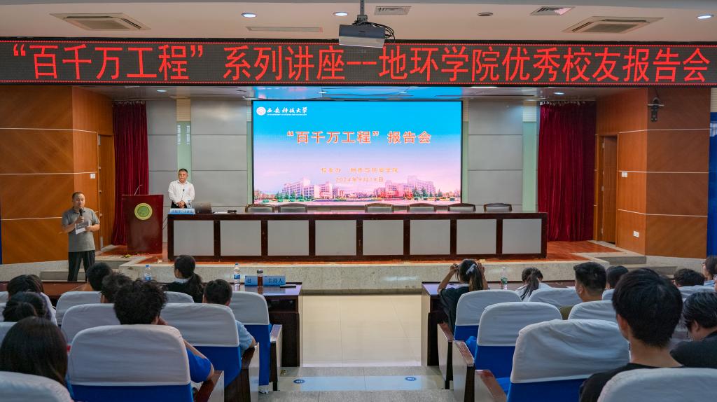 9月19日,学院在骊山校园图书馆二楼报告厅举办西安科技大学“百千万工程”报告会,地质工程专业本科2008届校友、国能神东布尔台煤矿副总工程师高振宇应邀作了题为“智能化煤矿工作经历分享”的报告,学院党委书记赵雪萍、教师代表、全体辅导员、学生代表300余人参加报告会,报告会由副院长赵洲主持。